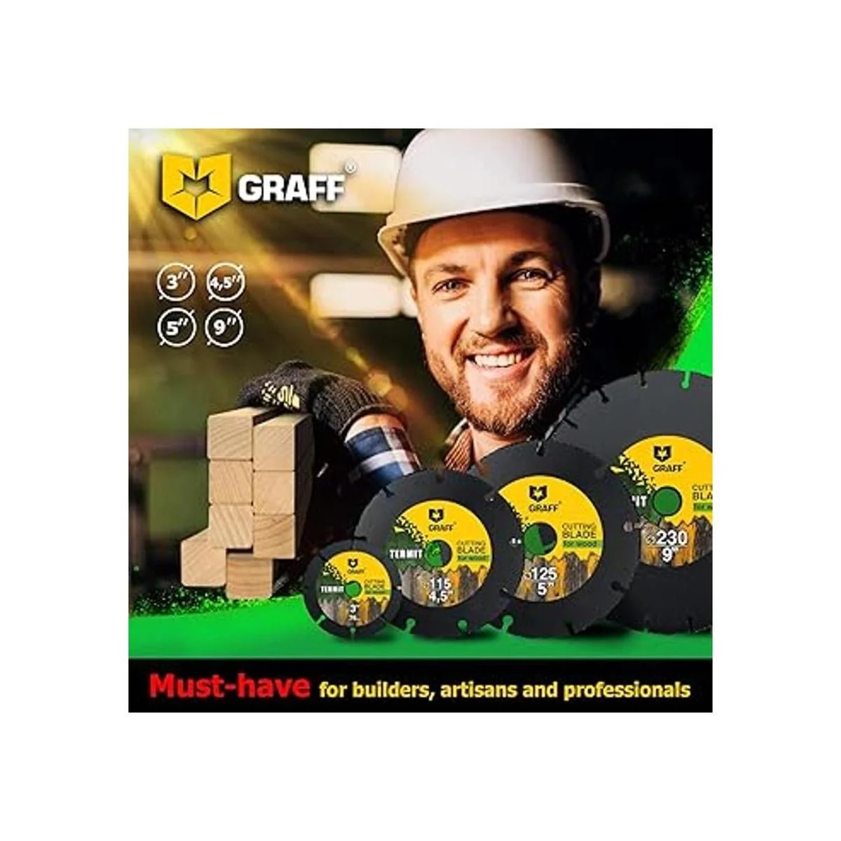 Cómodo en funcionamiento: la rueda de corte angular GRAFF Termit proporciona una molienda suave, tallado y un corte limpio. Esta rueda de corte de madera de 3 pulgadas está especialmente diseñada para trabajar con madera de cualquier raza y grado de dureza a alta velocidad de rotación 21 000 RPM.