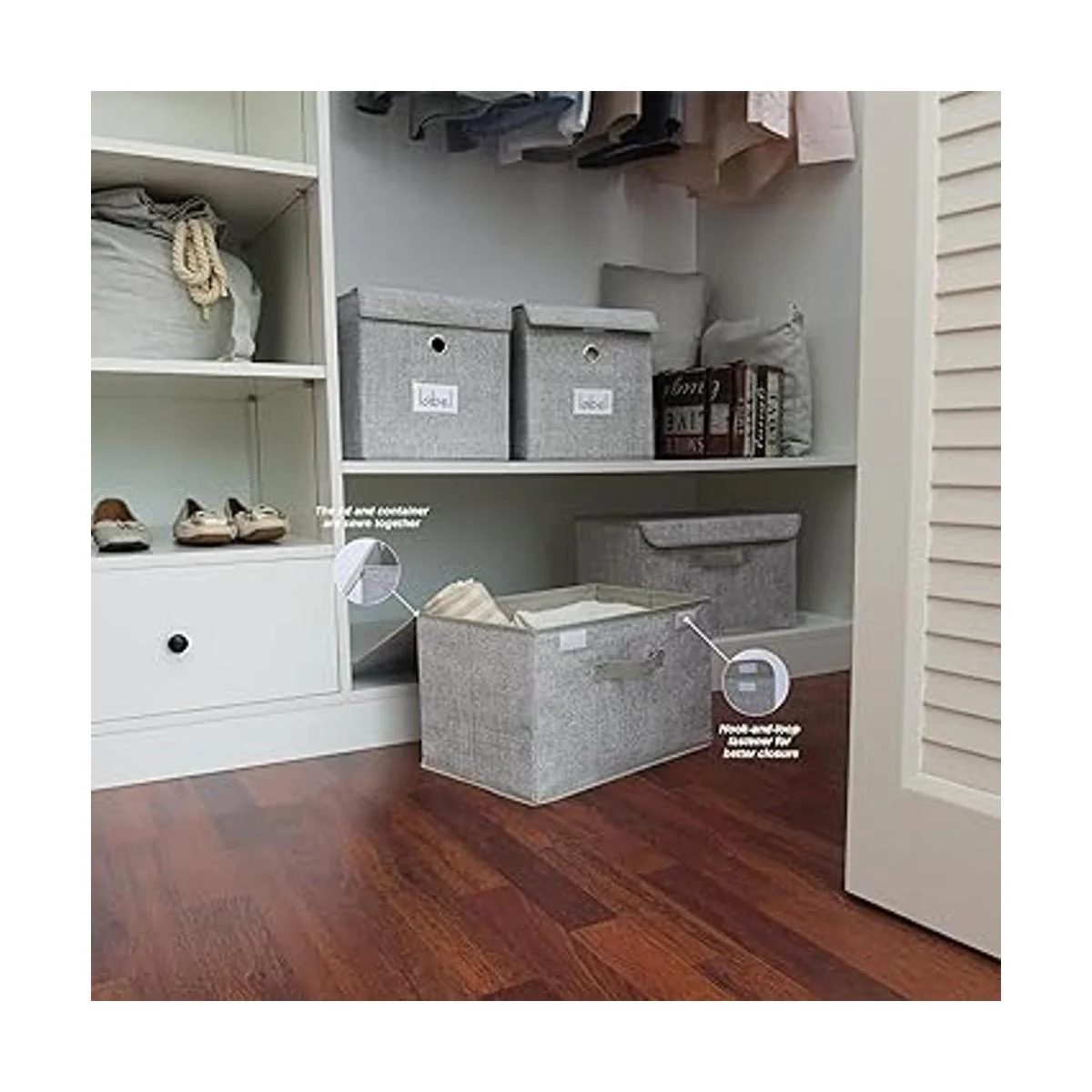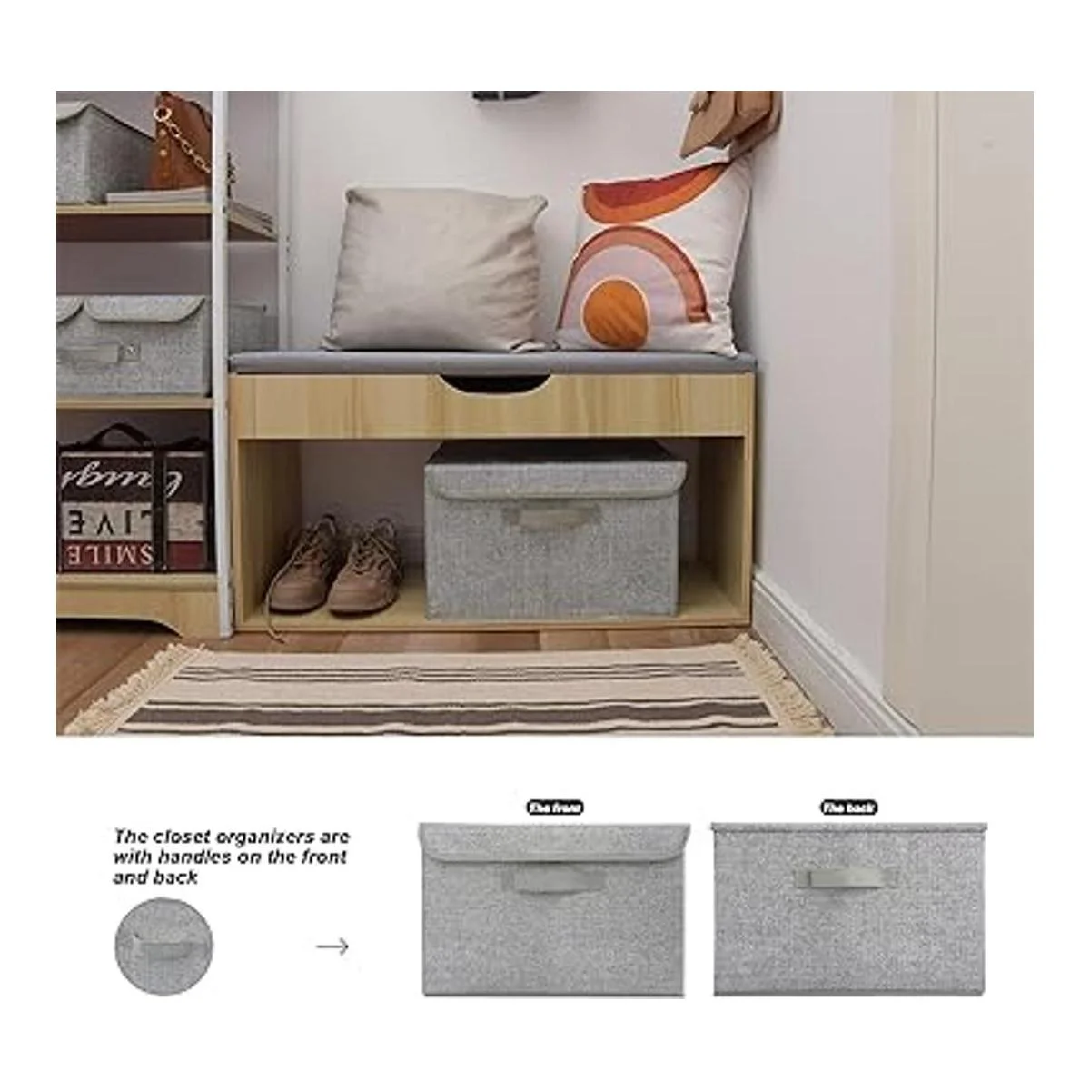 Diseño para mayor comodidad: con asas en la parte delantera y trasera, las cajas organizadoras de armario son convenientes para sacar del estante y fáciles de llevar.