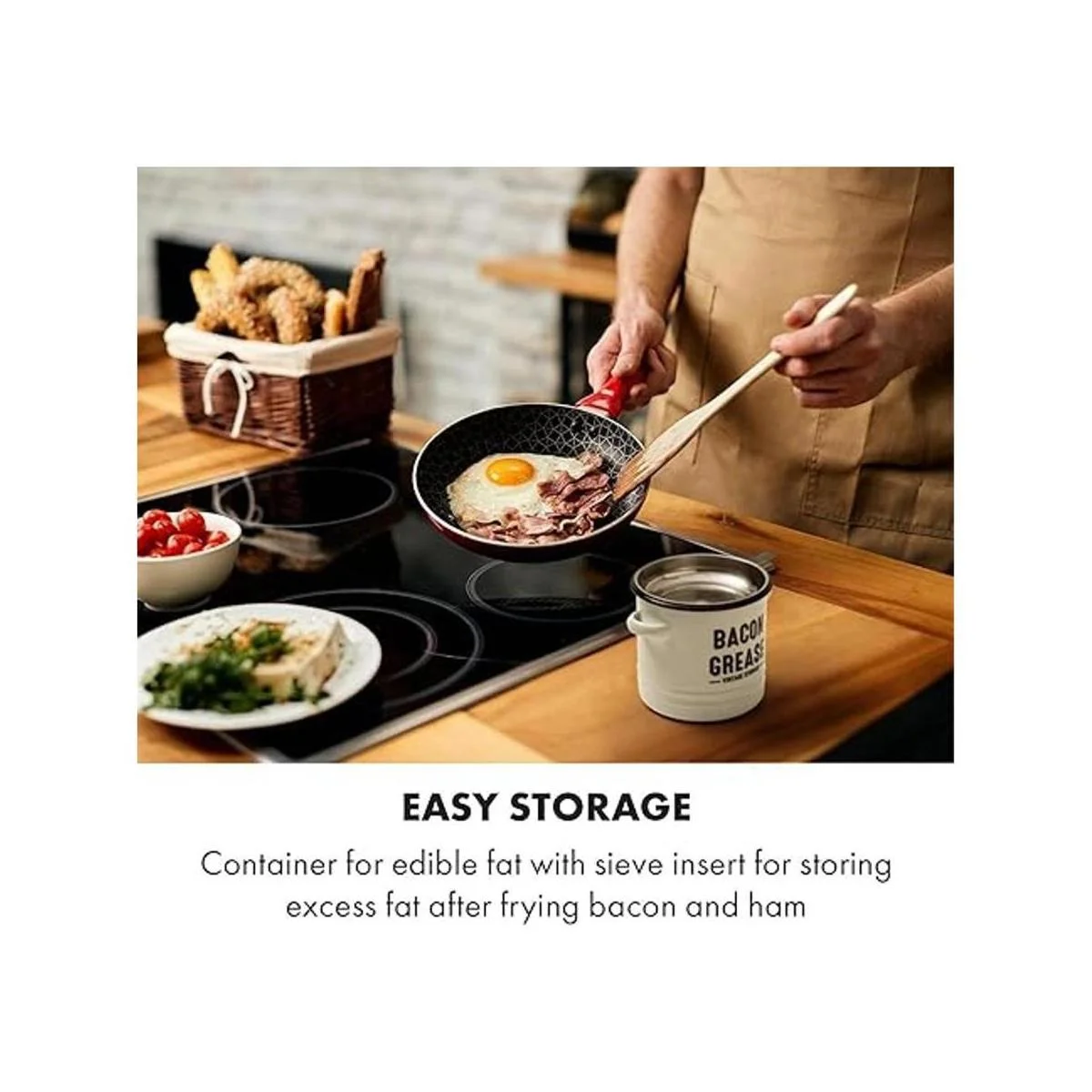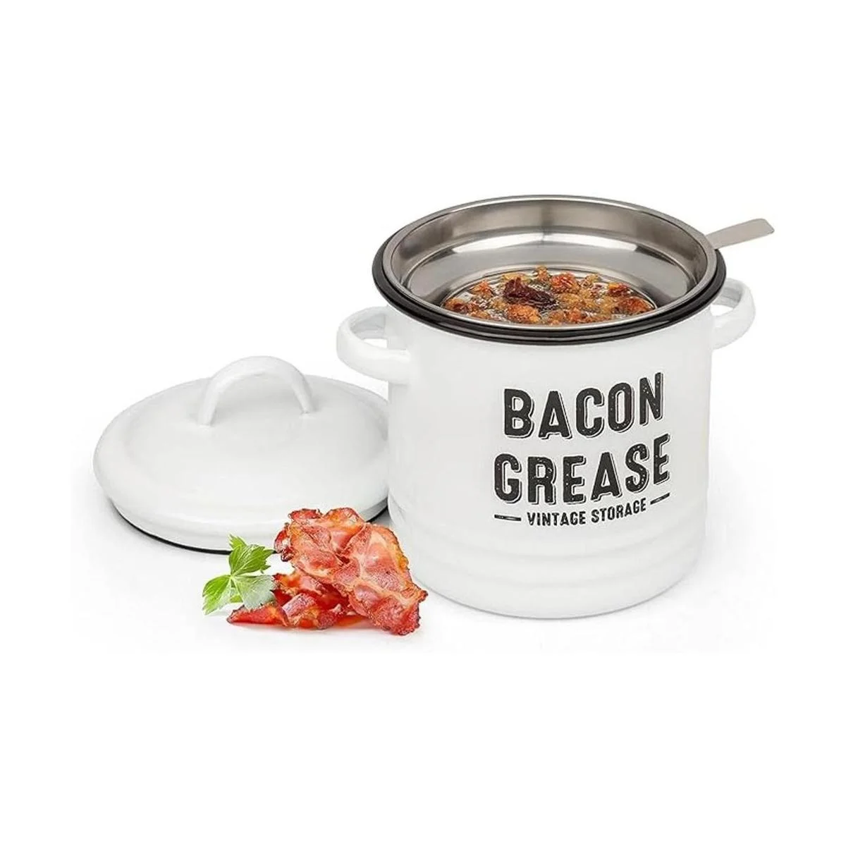El tamaño perfecto: muy espacioso sin ser intrusivo y con mucho espacio para almacenar fácilmente grasa de tocino, exceso de grasa y aceite de cocina. Revestimiento en polvo en un agradable blanco vintage con un tamaño de 5.5 x 5.5 x 5.9 pulgadas largo x ancho x alto.