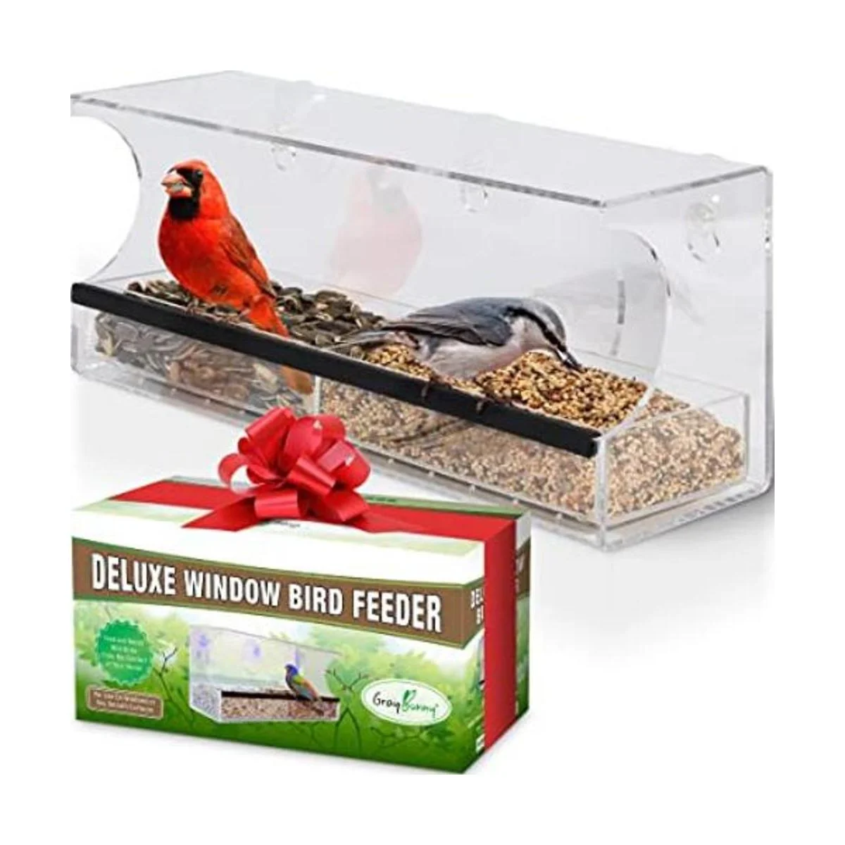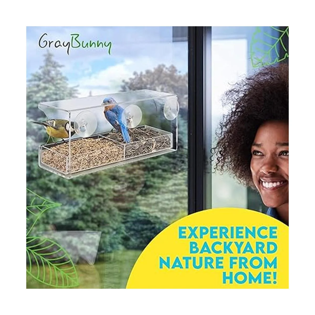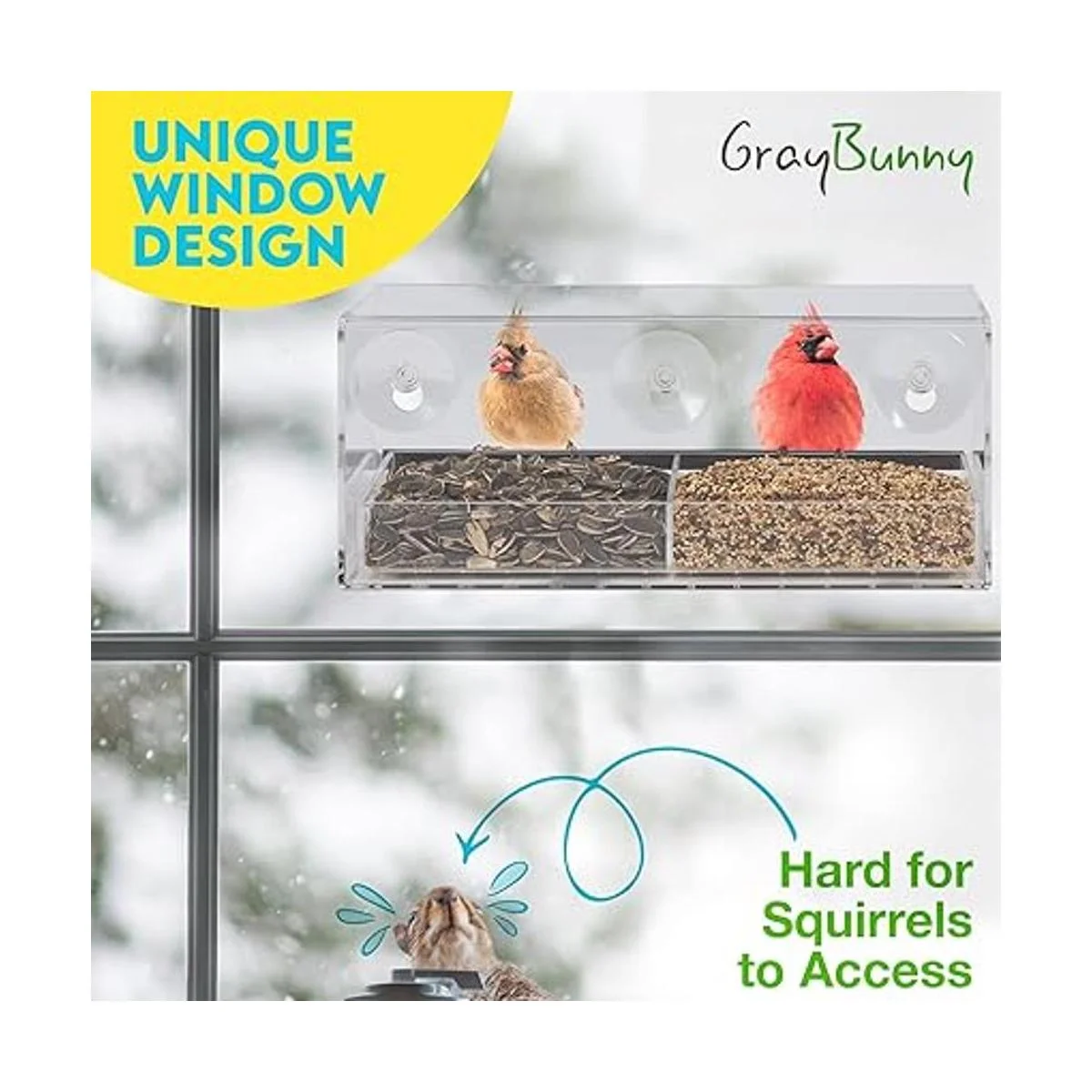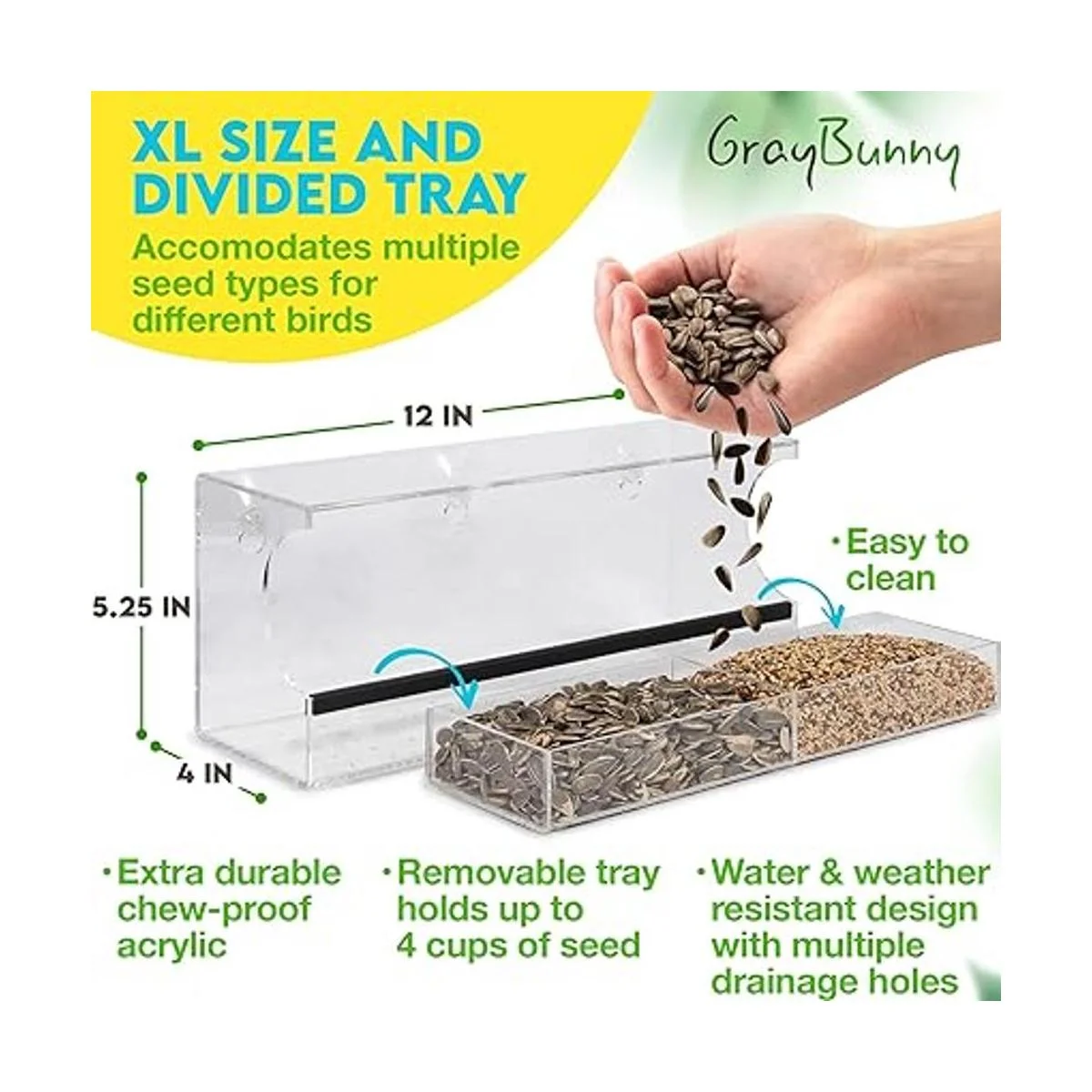 Gray Bunny Comedero transparente de lujo para pájaros con ventosas extra fuertes, comedero para pájaros al aire libre con agujeros de drenaje, bandeja extraíble, gran capacidad de semillas y percha de goma