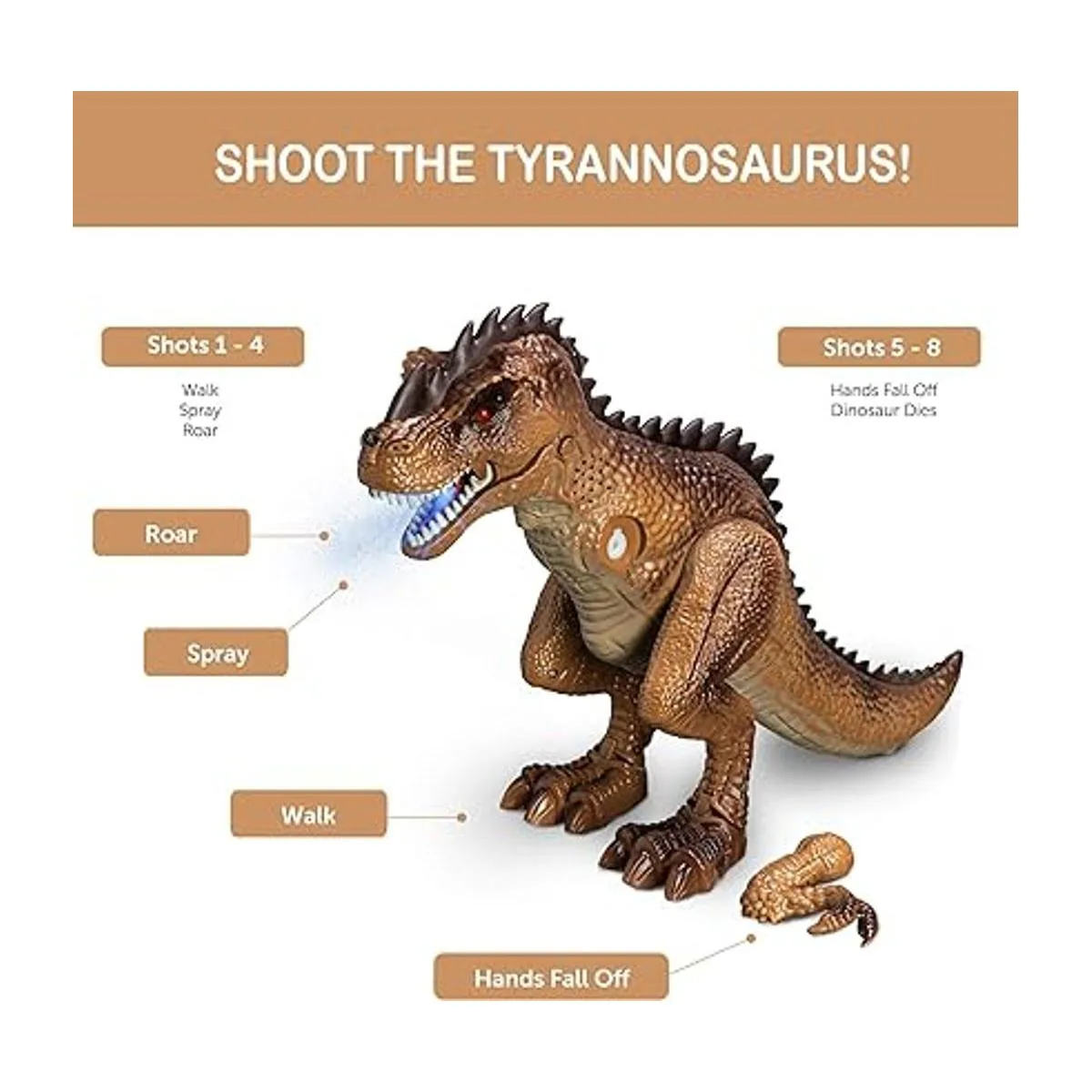 El TYRANNOSAURUS REX está de vuelta, pero solo tú puedes detener que se prepara para una acción emocionante y una poderosa activación de doble botón situada en la parte inferior del juguete de dinosaurio T Rex disparar el Tyrannosaurus Rex 9 veces disparos 14 dinosaurio rociará rugido e iluminará, a 58 disparando su mano caerá. En el tiro 9 se cae de llanto y muerte. Utiliza la botella de plástico proporcionada para llenar el agua en el agujero para la función de pulverización de niebla.