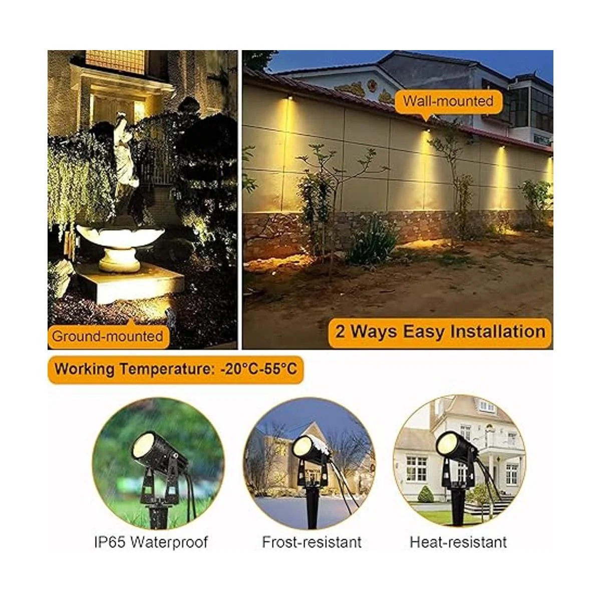 Focos impermeables IP65 para exteriores: los focos para exteriores están hechos de un cuerpo de aluminio grueso, cubierta de lente de vidrio y estaca de metal duradera que protege contra cualquier corrosión, grietas u óxido. El diseño impermeable IP65 puede soportar el clima más extremo terrible.