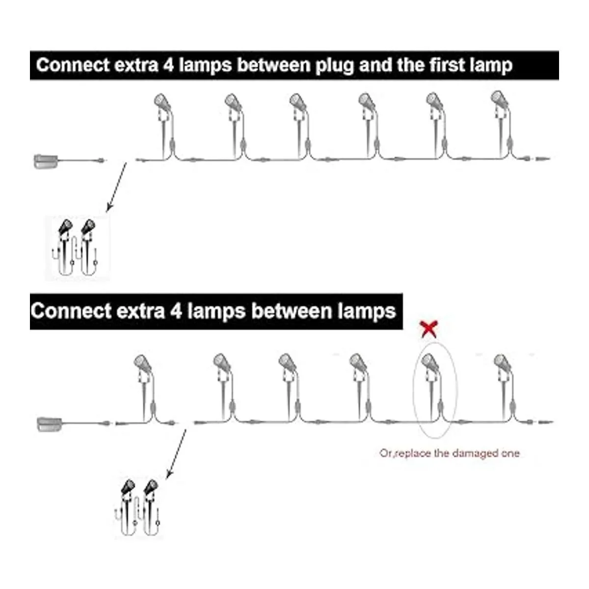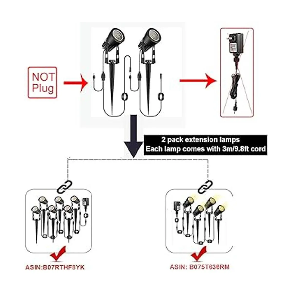 Sin enchufe/adaptador, solo 2 luces de extensión de 3 W para 4 unidades y 6 unidades de iluminación de paisaje ASIN: B075T636RM y ASIN: B07RTHF8YK