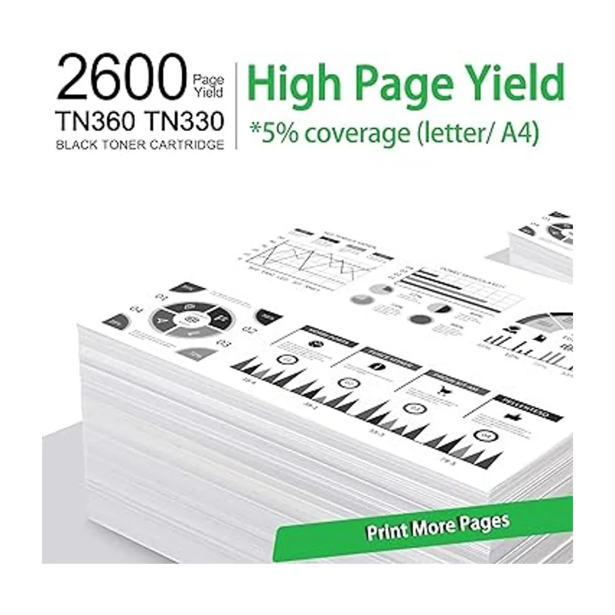 Rendimiento de páginas: hasta 2.600 páginas por cartucho de tóner negro TN360 basado en una cobertura del 5 del papel tamaño carta. El rendimiento real del tóner varía con el uso, gráficos impresos y condiciones ambientales.