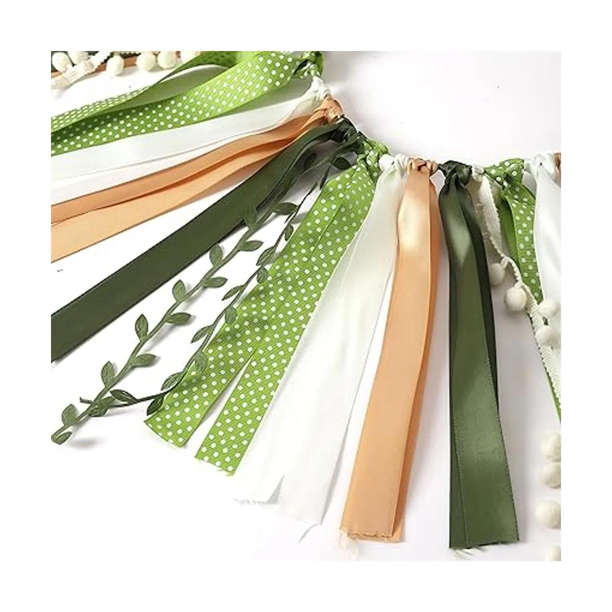 Diseño especial: esta guirnalda está hecha de varios tipos de tela: verde, marfil, cinta dorada, pompón blanco, cinta de vid verde, todos ellos dan un bonito aspecto único y hacen que la decoración de tu fiesta sea especial.
