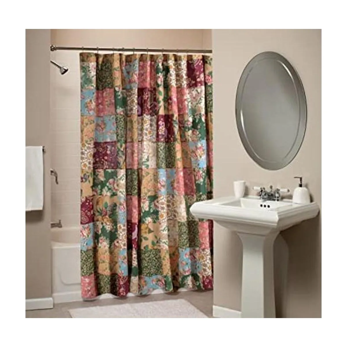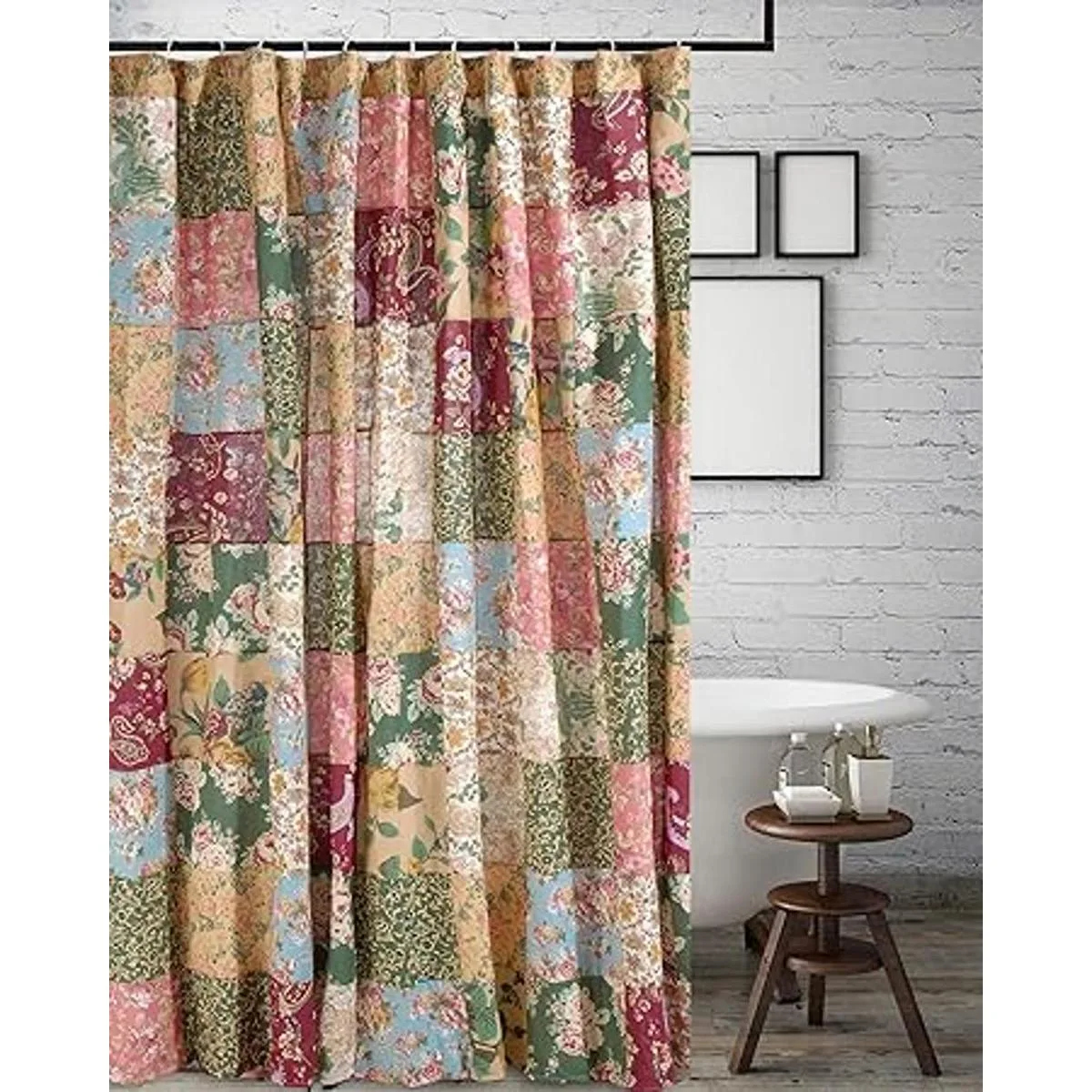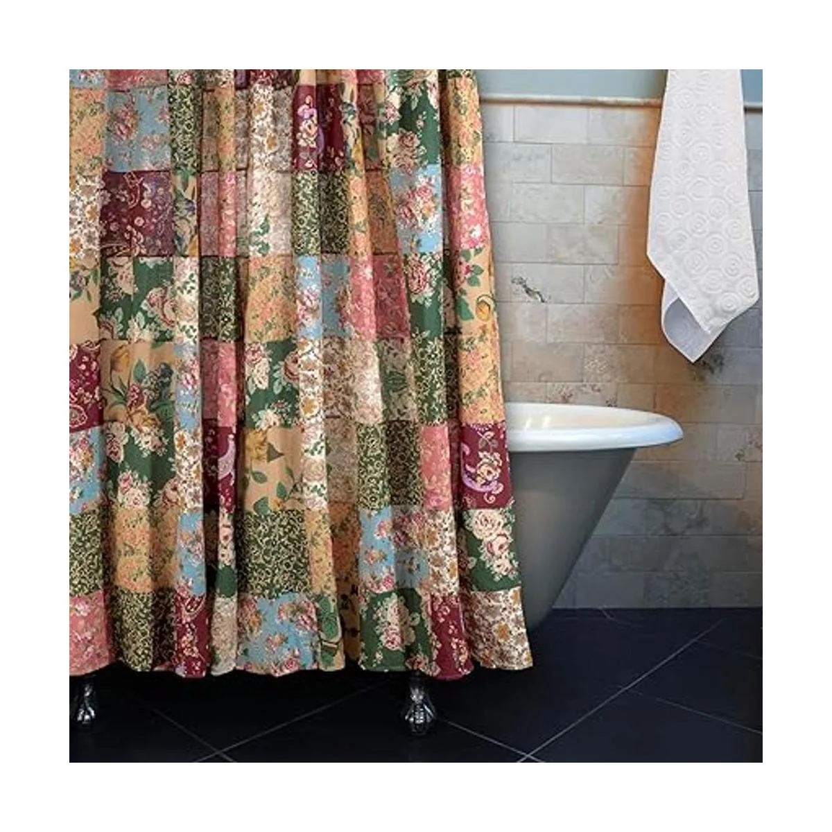 Encantadores estampados florales combinados con cachemira crean esta intrincada cortina de ducha de retazos
