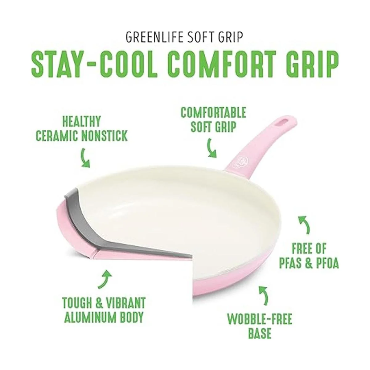 GreenLife Soft Grip Sartén antiadherente de cerámica saludable de 11 pulgadas, sin PFAS, apto para lavavajillas, rosa suave