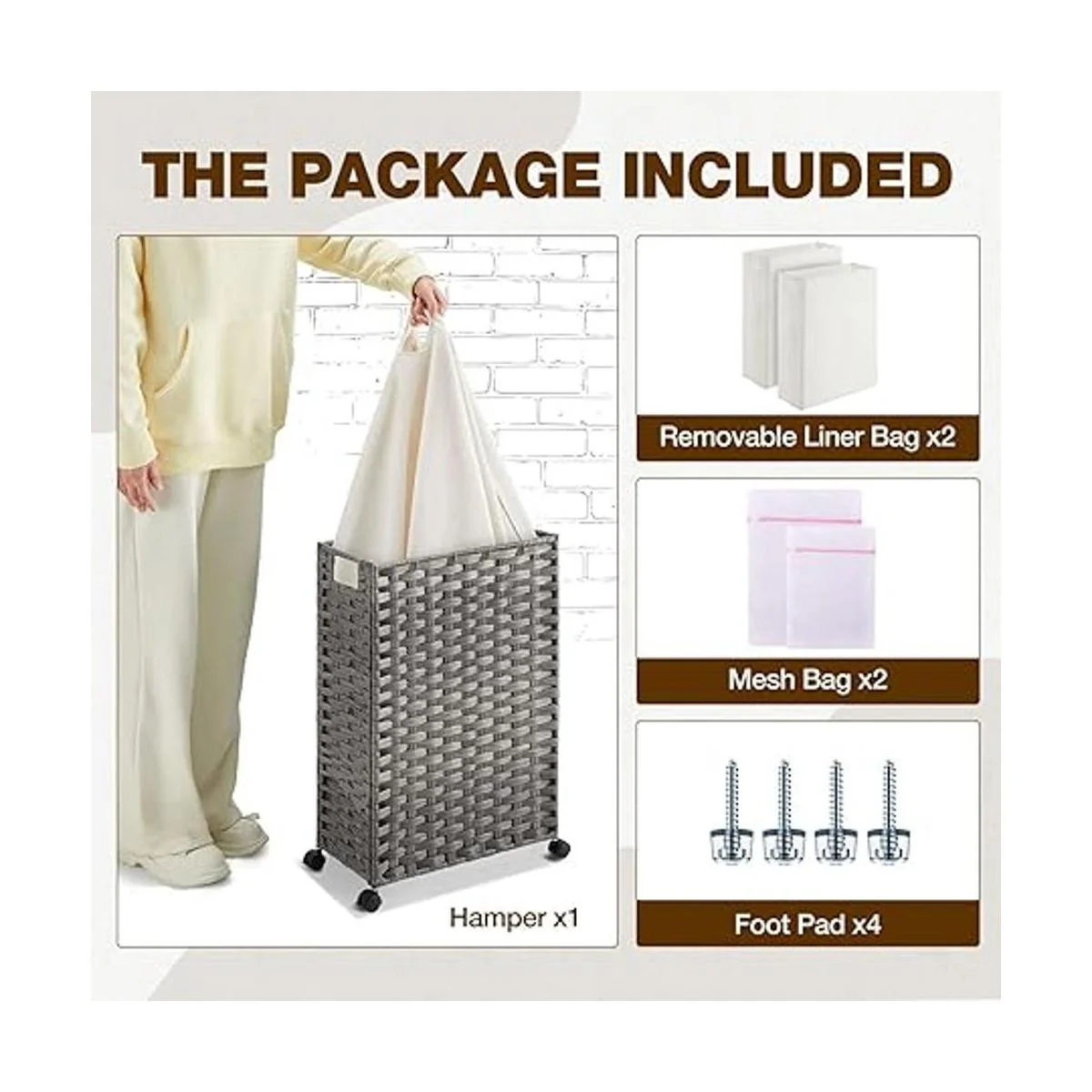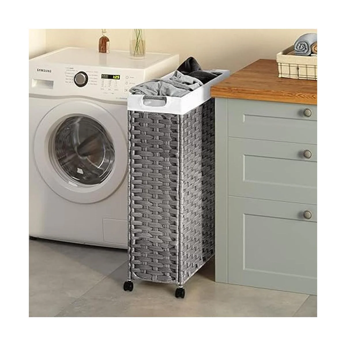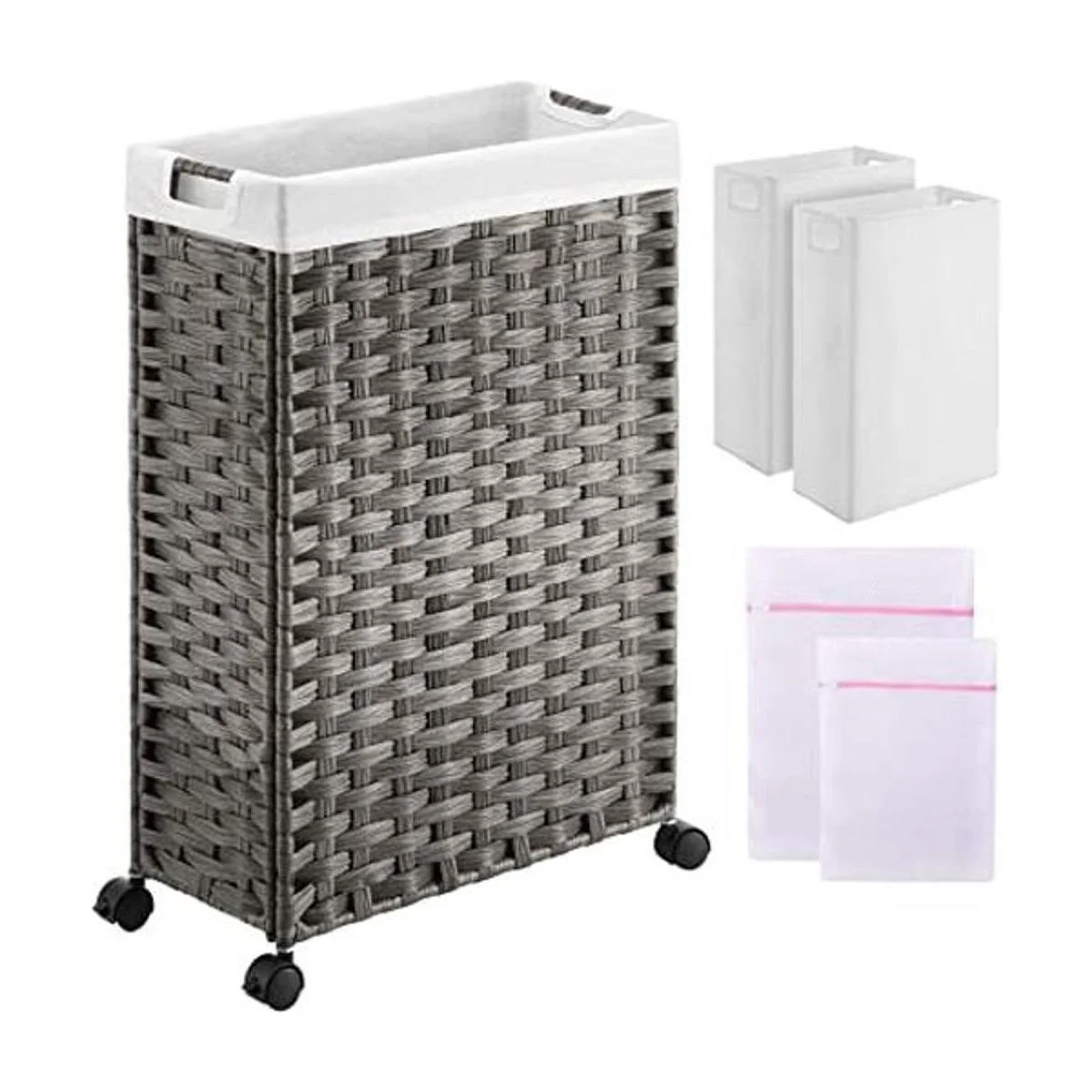 Greenstell Cesta de lavandería con ruedas, cesta delgada de 22 pulgadas con 2 bolsas de forro extraíbles y 2 bolsas de malla, cesta estrecha para ropa sucia, organizador de ratán sintético tejido a mano en baño, dormitorio, gris