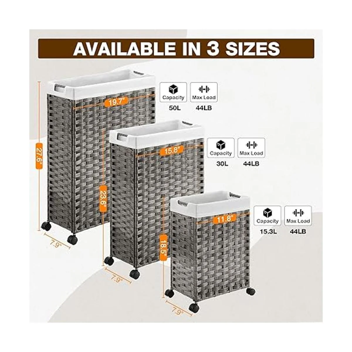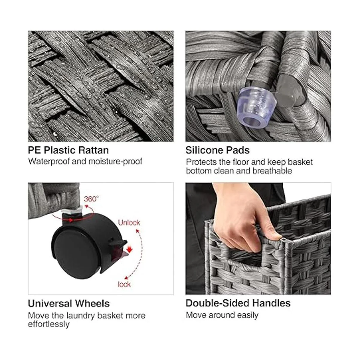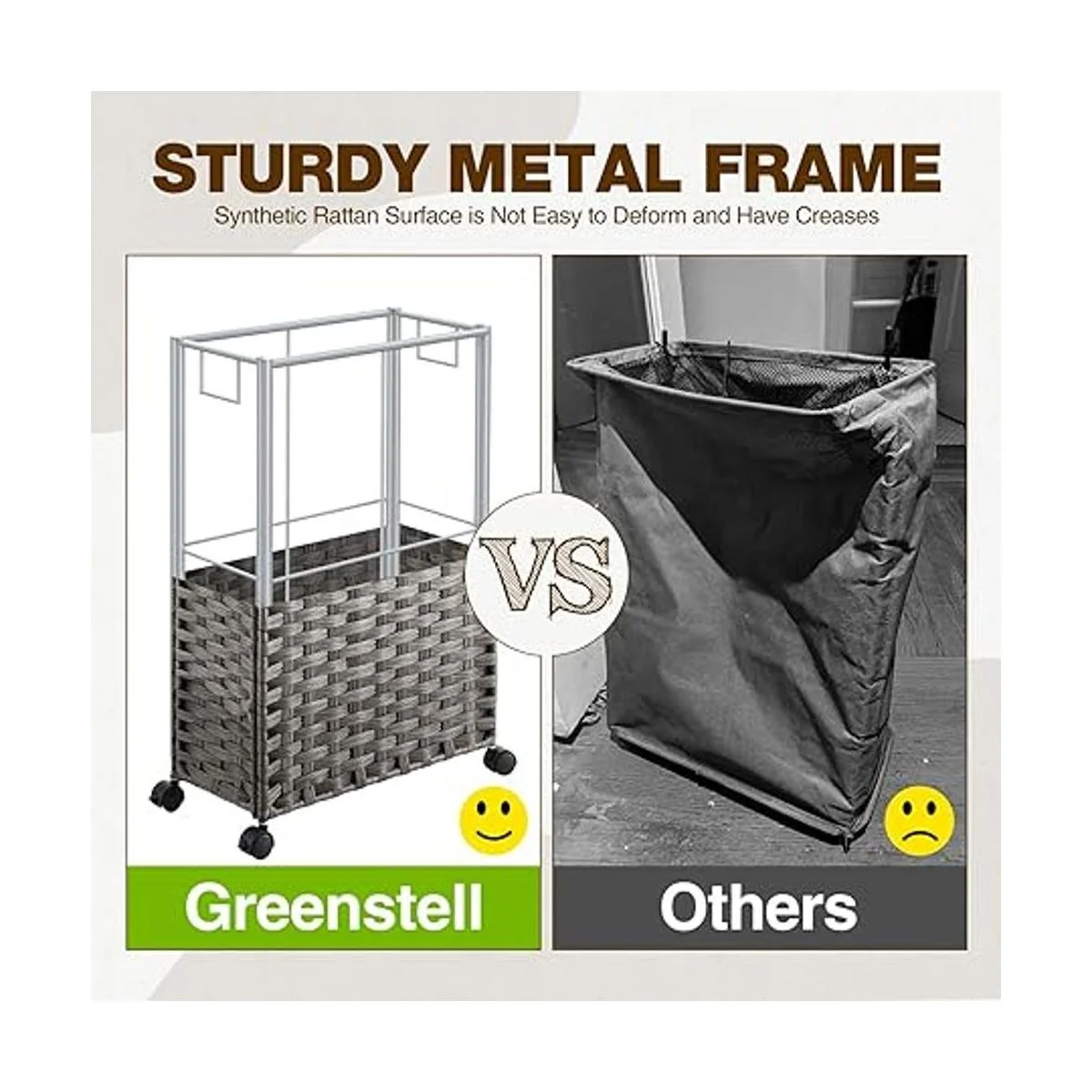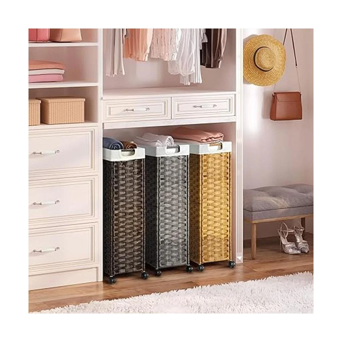Greenstell Cesta de lavandería con ruedas, cesta delgada de 22 pulgadas con 2 bolsas de forro extraíbles y 2 bolsas de malla, cesta estrecha para ropa sucia, organizador de ratán sintético tejido a mano en baño, dormitorio, gris