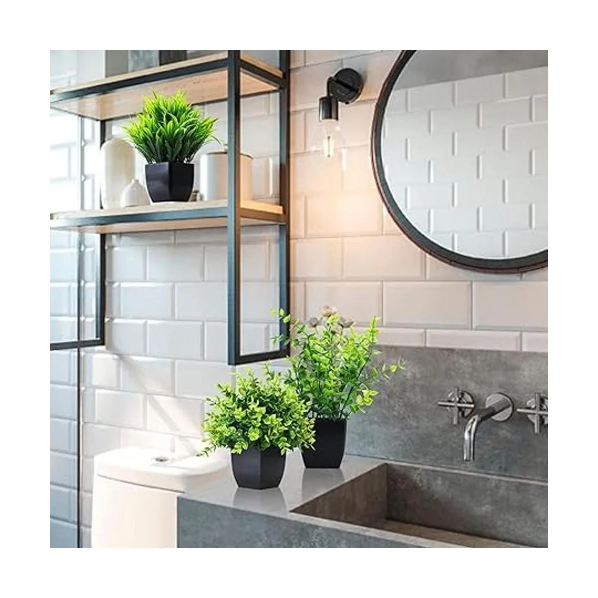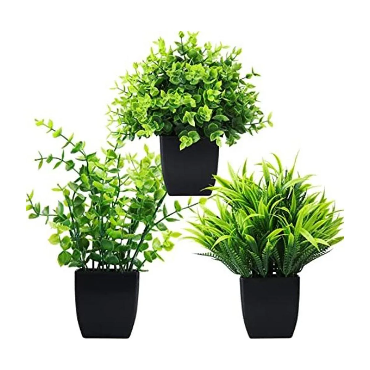 Decoración potente: 3 mini plantas falsas, 1 hoja de hierba de trigo y 2 plantas en maceta de hoja de eucalipto, exuberantes y realistas. Las plantas artificiales vibrantes se combinan con macetas negras, que son simples pero elegantes. Puede ser una buena opción cuando no sabes si el producto que elijas coincidirá con el medio ambiente de tu hogar.