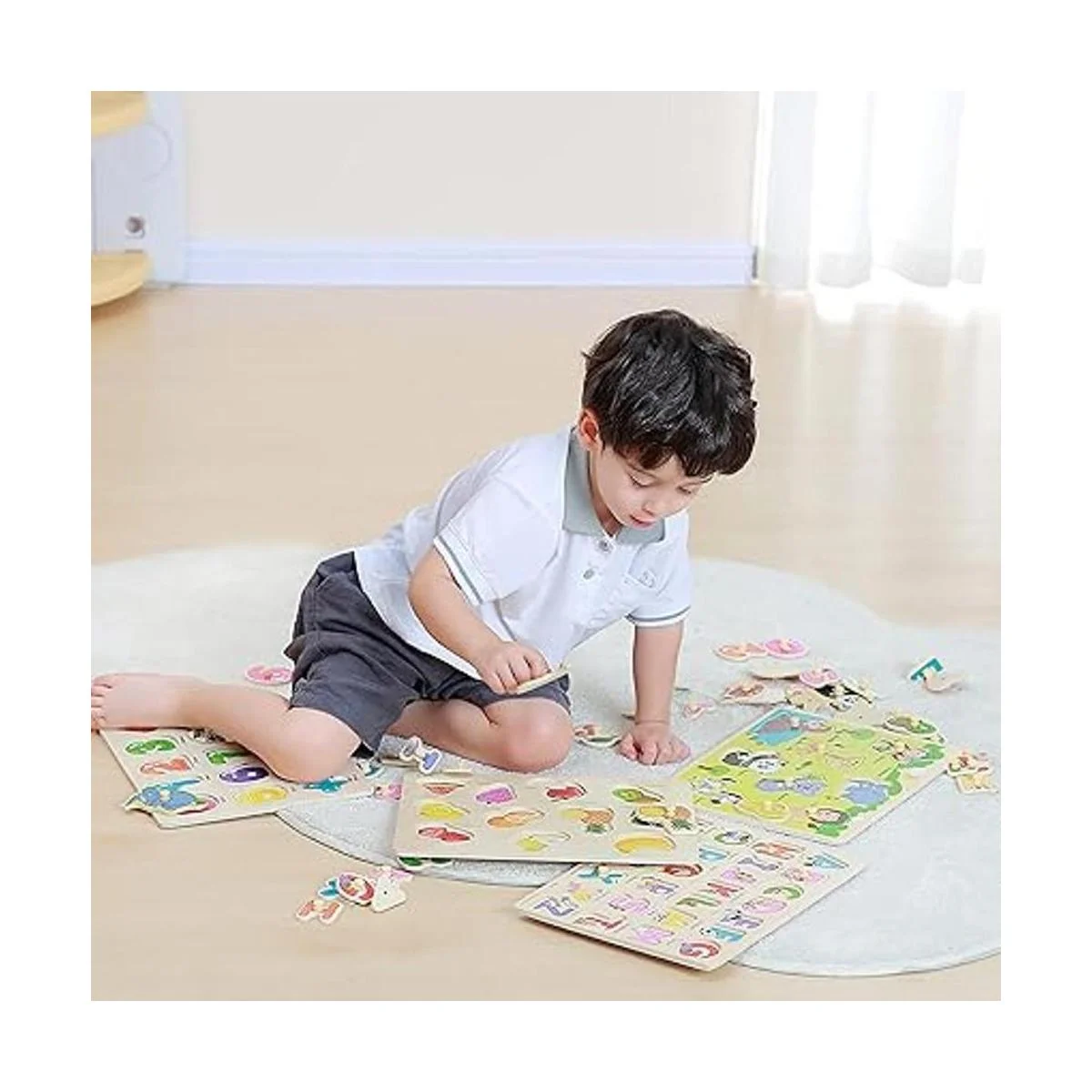 Juego de 4 rompecabezas de clavijas de madera: nuestro juego de rompecabezas incluye un rompecabezas de números con 15 números de piezas, un rompecabezas ABC con 26 piezas del alfabeto, un rompecabezas de animales salvajes con 8 piezas de animales, y un rompecabezas de frutas con 11 piezas de frutas diferentes.