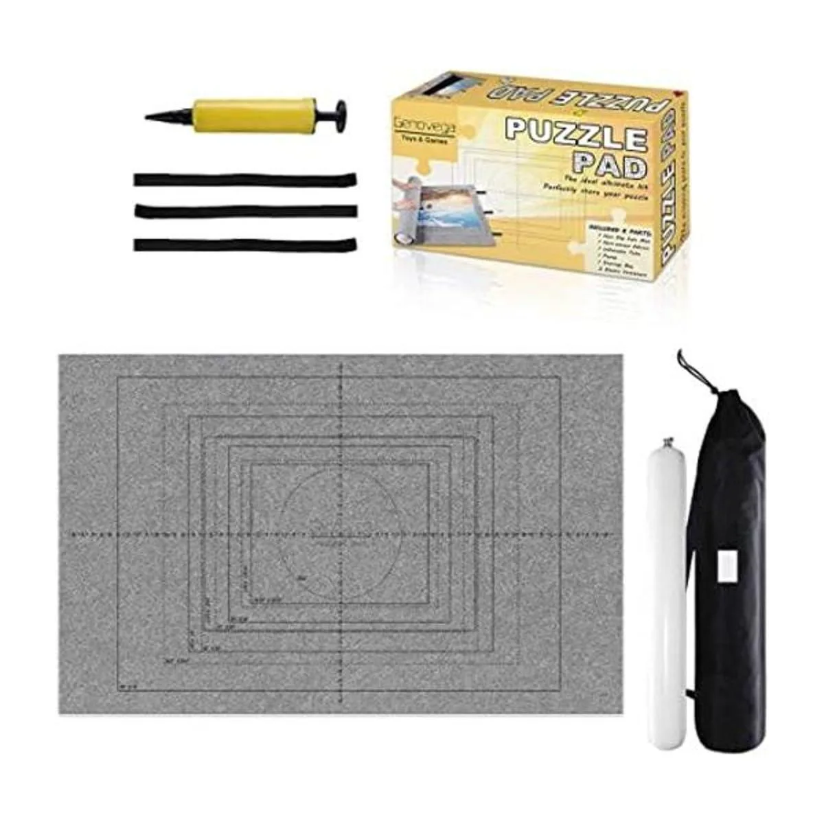 El kit ideal definitivo En comparación con otros productos, nuestro tapete enrollable para rompecabezas tiene todos los accesorios incluidos: 1 tapete de fieltro antideslizante, 1 tubo inflable, 1 bomba de mano, 1 bolsa de almacenamiento y 3 correas de velcro ajustables. Nuestro kit tiene todas las características que has soñado.