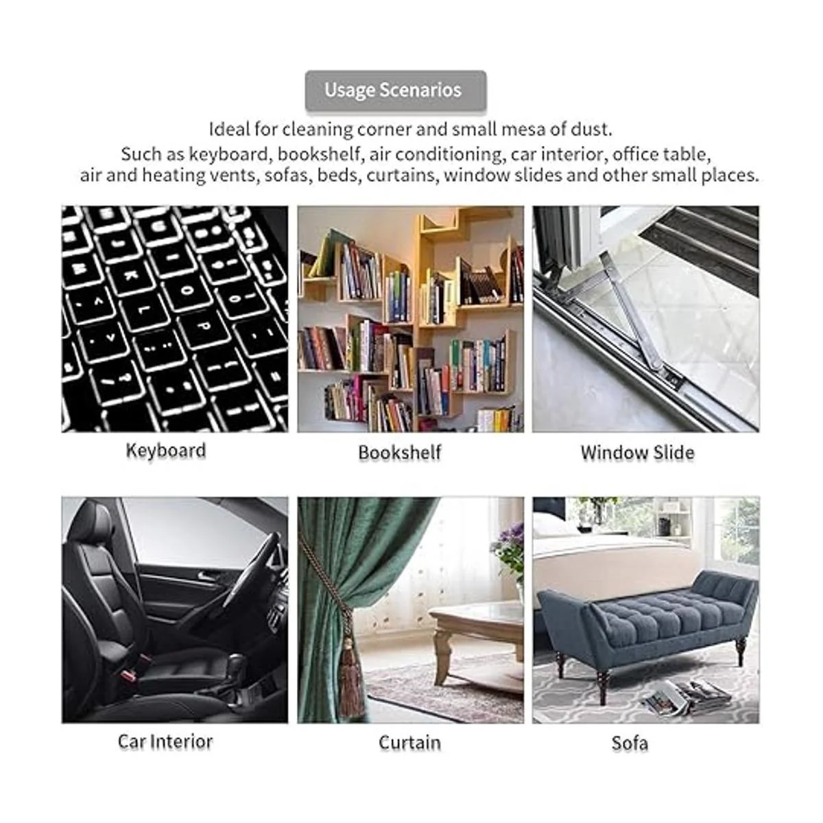 Escenarios de uso: ideal para eliminar la suciedad y los desechos de grietas estrechas. Como teclado, estantería, aire acondicionado, interior de coche, mesa de oficina, ventilación de aire y calefacción, sofás, camas, cortinas, diapositivas de ventana, zócalo, esquina de la pared y otros lugares pequeños