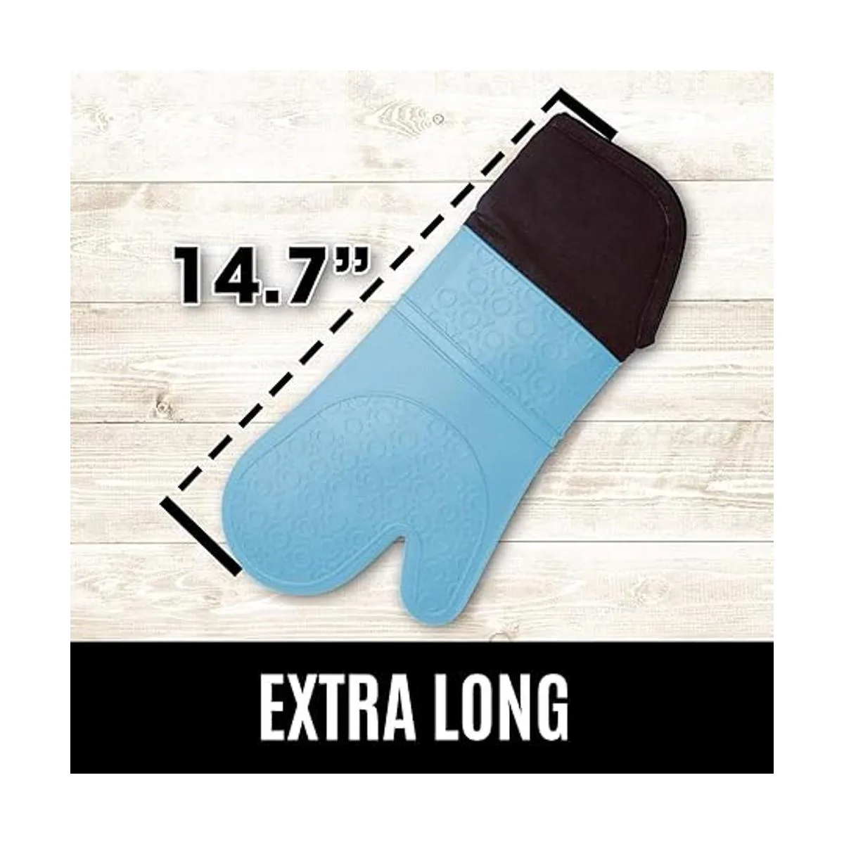 Superior Safety Length At 13.7 inches long, our oven mitts better protect fingers, hands and wrists from burns. The longer wrist protection keeps you protected from fingertip to past your wrist. This lets you grip pots, pans and cookware safely without slips or spills.