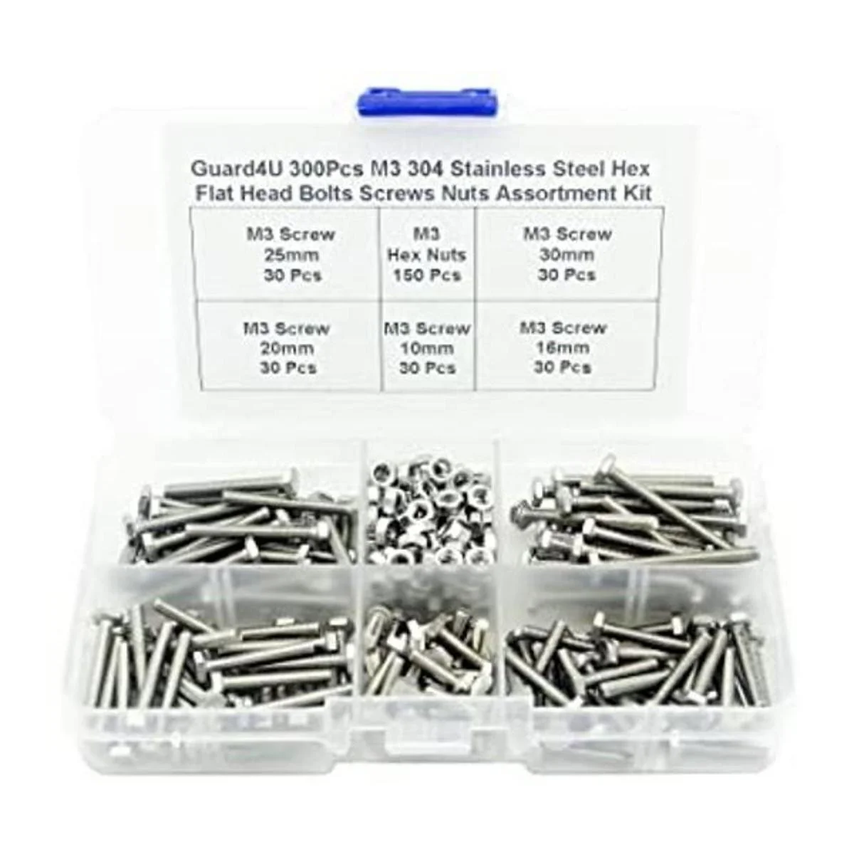 Guard4U 300 tornillos de cabeza plana hexagonales de acero inoxidable M3 304, kit surtido de tornillos, tornillos hexagonales exteriores métricos hexagonales y tuercas