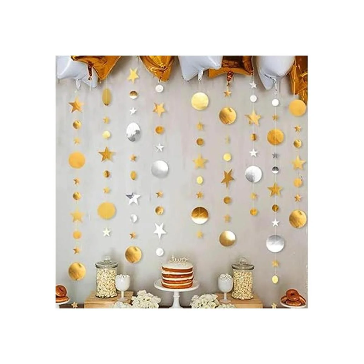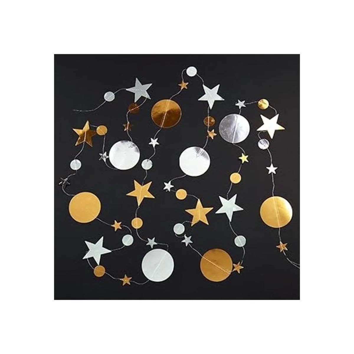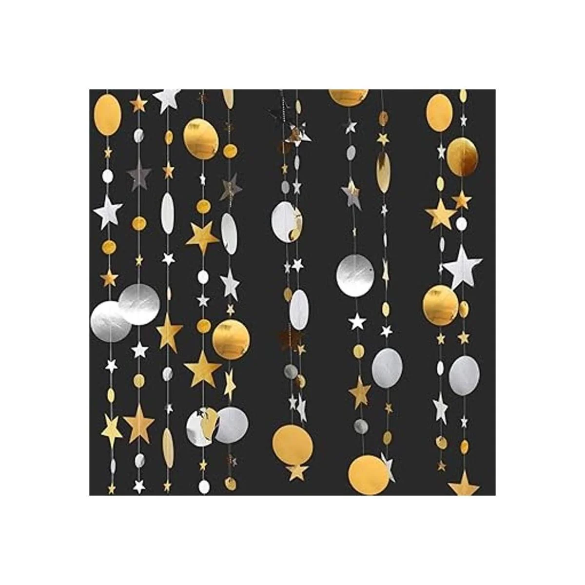 Diseño único: el diseño combinado de oro metálico y plata hacen que esta guirnalda sea tan bonita y única, hermosa combinación de estrellas y círculos con brillo metálico, múltiples formas de estrellas y círculos brillantes en varios tamaños, hacen una fiesta completamente diferente para ti.