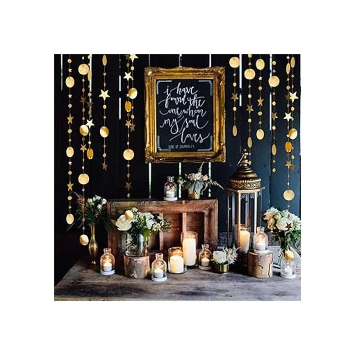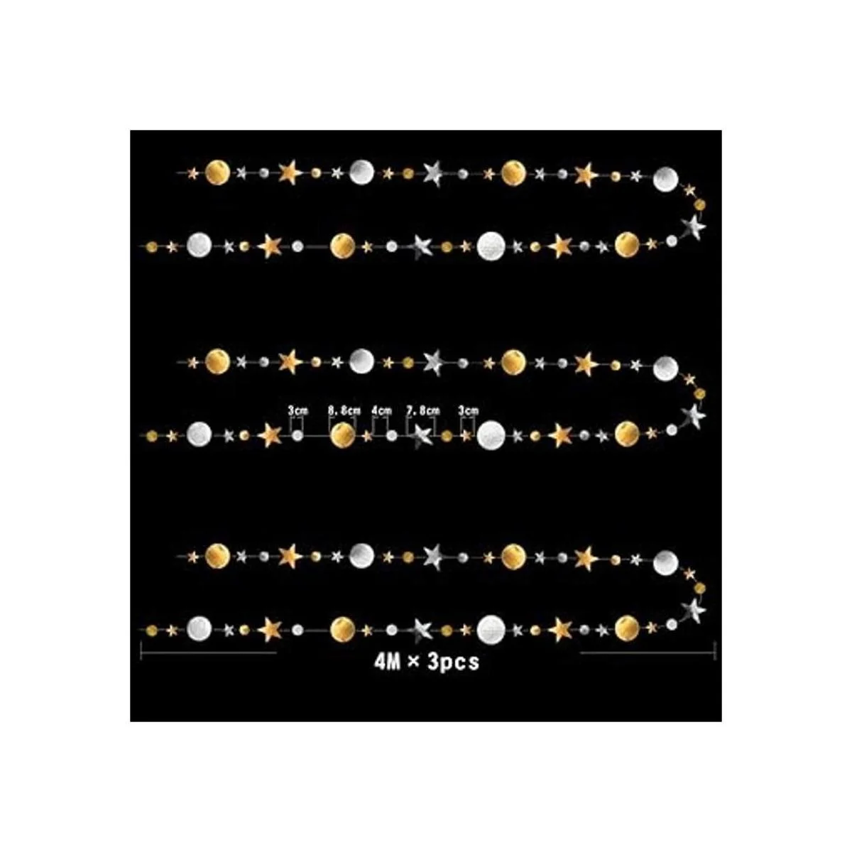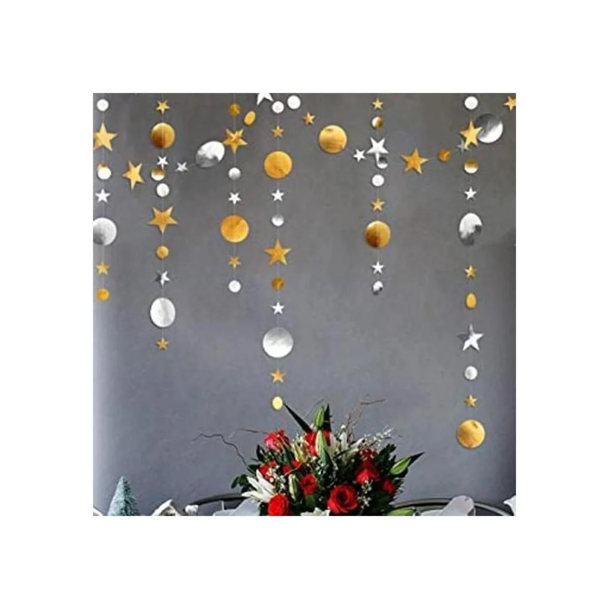 Diseño único: el diseño combinado de oro metálico y plata hacen que esta guirnalda sea tan bonita y única, hermosa combinación de estrellas y círculos con brillo metálico, múltiples formas de estrellas y círculos brillantes en varios tamaños, hacen una fiesta completamente diferente para ti.