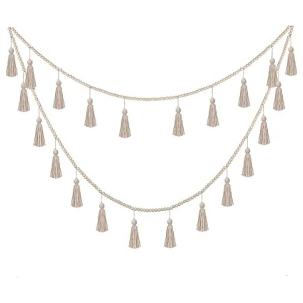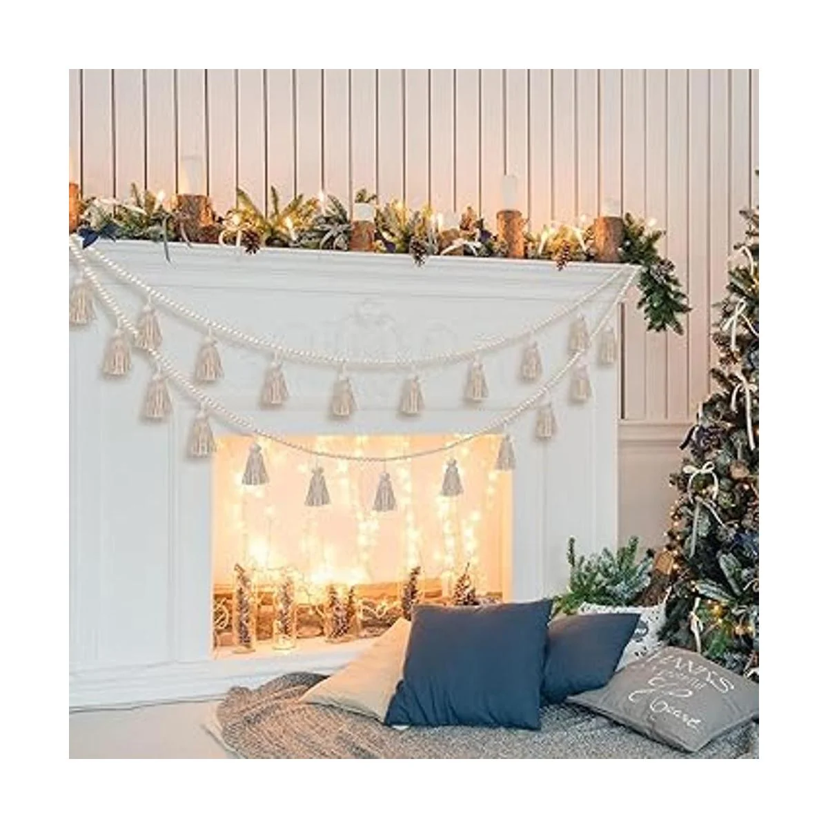 Guirnalda de cuentas de madera con borlas de 9.8 pies para colgar en la pared, casa de campo, decoración rústica para vacaciones