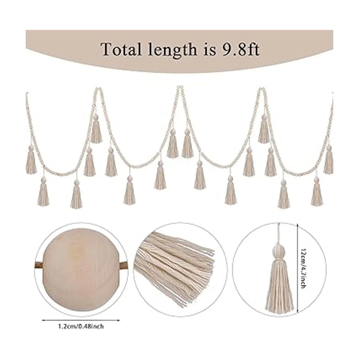 Información sobre el tamaño: recibirás 1 guirnalda de cuentas de madera con borlas, la longitud total de la guirnalda es de aproximadamente 9.8 ft, las cuentas de madera miden aprox. 0.5 pulgadas de diámetro y las borlas del colgante son de aproximadamente 4.7 pulgadas de largo