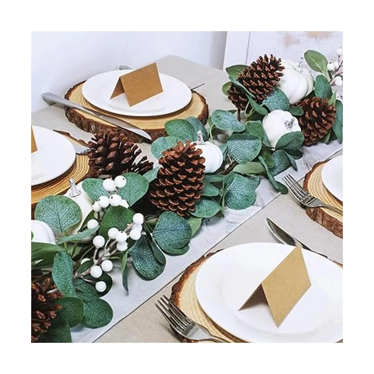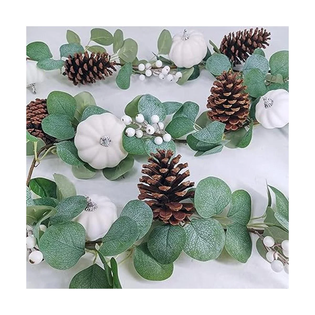 Guirnalda de eucalipto artificial de calabaza blanca con calabazas blancas, piñones, bayas, follaje de otoño, guirnalda para arco de boda, telón de fondo, camino de acción de gracias, 2 unidades