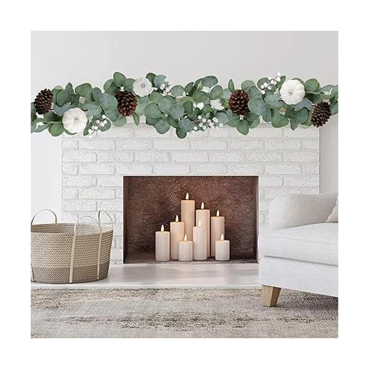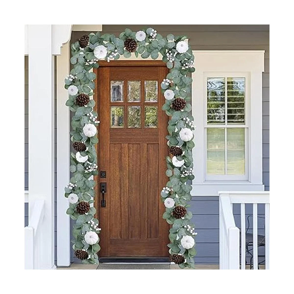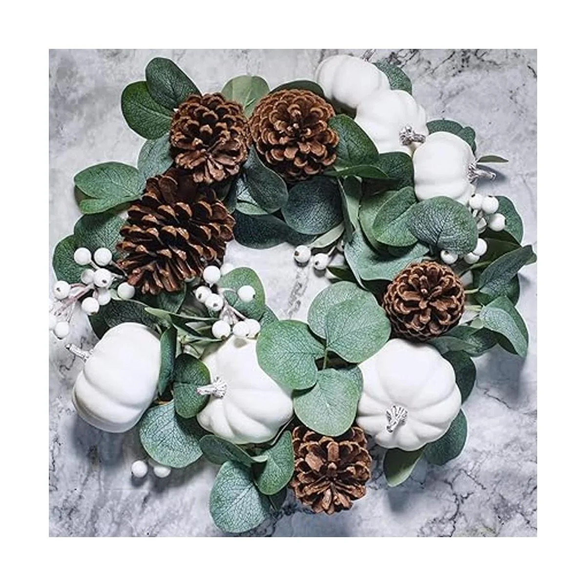 Color: con hojas de eucalipto verde grisáceo acentuadas con calabazas blancas de tiza, piñas naturales y bayas blancas brillantes, esta guirnalda de otoño puede transformarse fácilmente a través de los meses de vacaciones con algunas adiciones, manteniendo tu espacio fresco y acogedor para tus invitados.