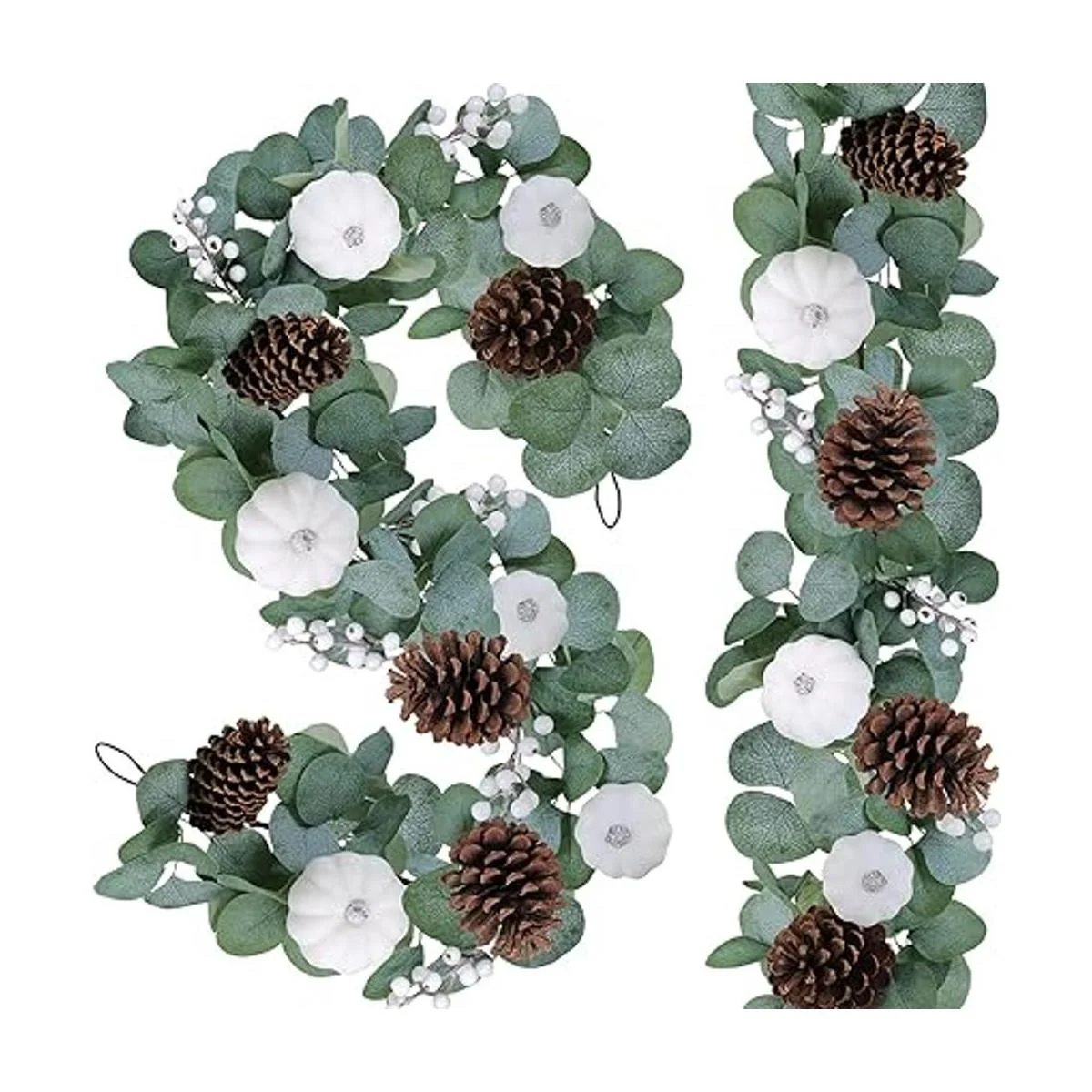 Paquete: 2 guirnaldas de hojas de eucalipto artificiales de plata de 5.9 ft de largo con calabazas blancas, piñas y bayas. Cada guirnalda de calabaza blanca tiene un lazo en uno de los extremos para colgar fácilmente.