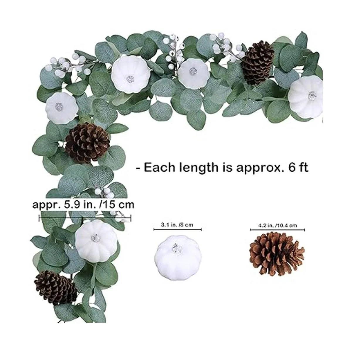 Dimensión: cada guirnalda de eucalipto sintético mide aproximadamente 5.9 ft de largo y 5.9 in de ancho. Las calabazas blancas están en 2 tamaños, 2.9 pulgadas de alto y 3.2 pulgadas de ancho grande, 2.2 pulgadas de alto y 2.4 pulgadas de ancho pequeño.