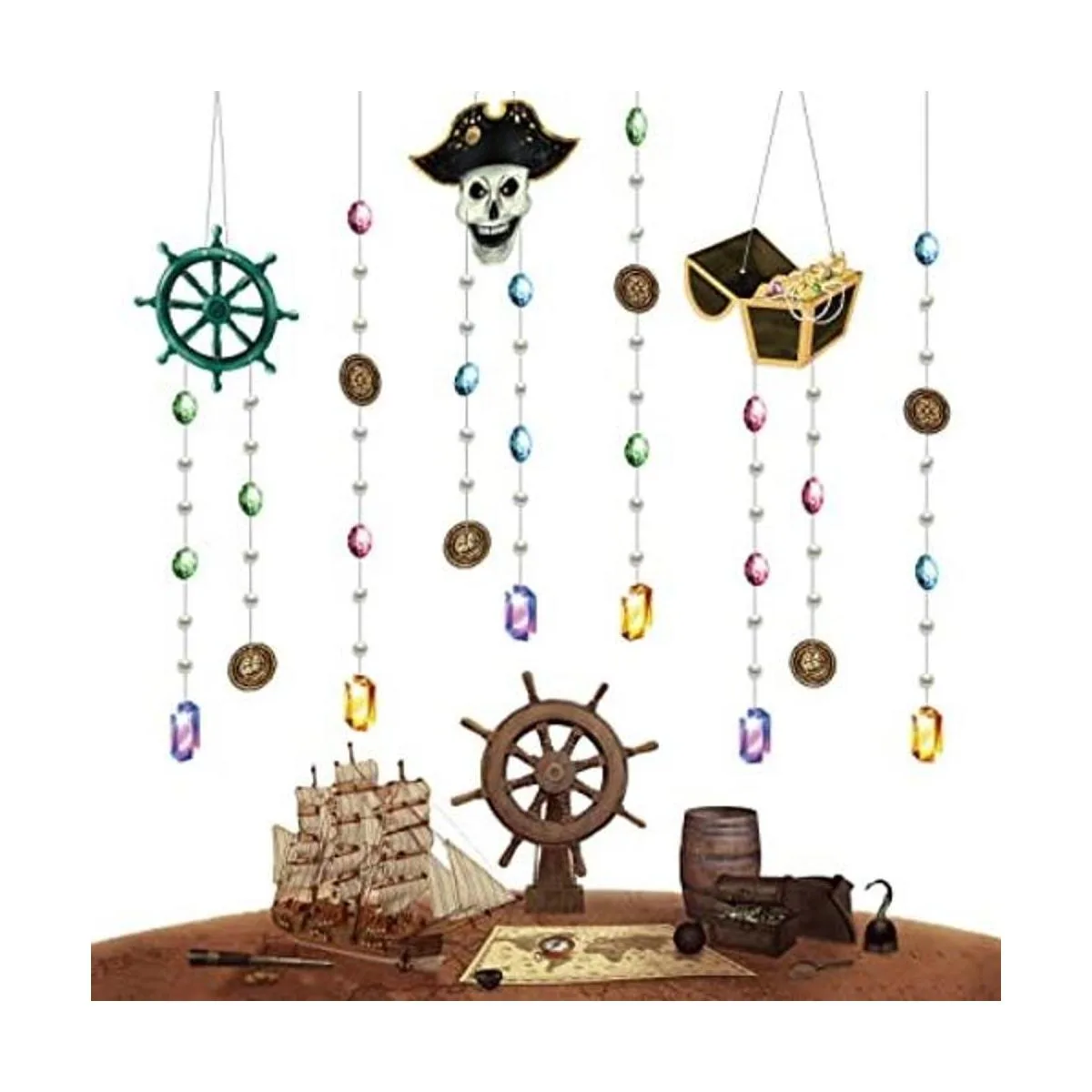 El paquete incluye: 6 unidades. kit de guirnaldas piratas. 3 de ellos son una sola hebra de diamantes coloridos, perlas y moneda de oro cosida junto con un hilo plateado. Las otras 3 guirnaldas son dúplex con 2 hebras unidas a un gran corte de calavera pirata, caja brillante del tesoro o rueda de barco.