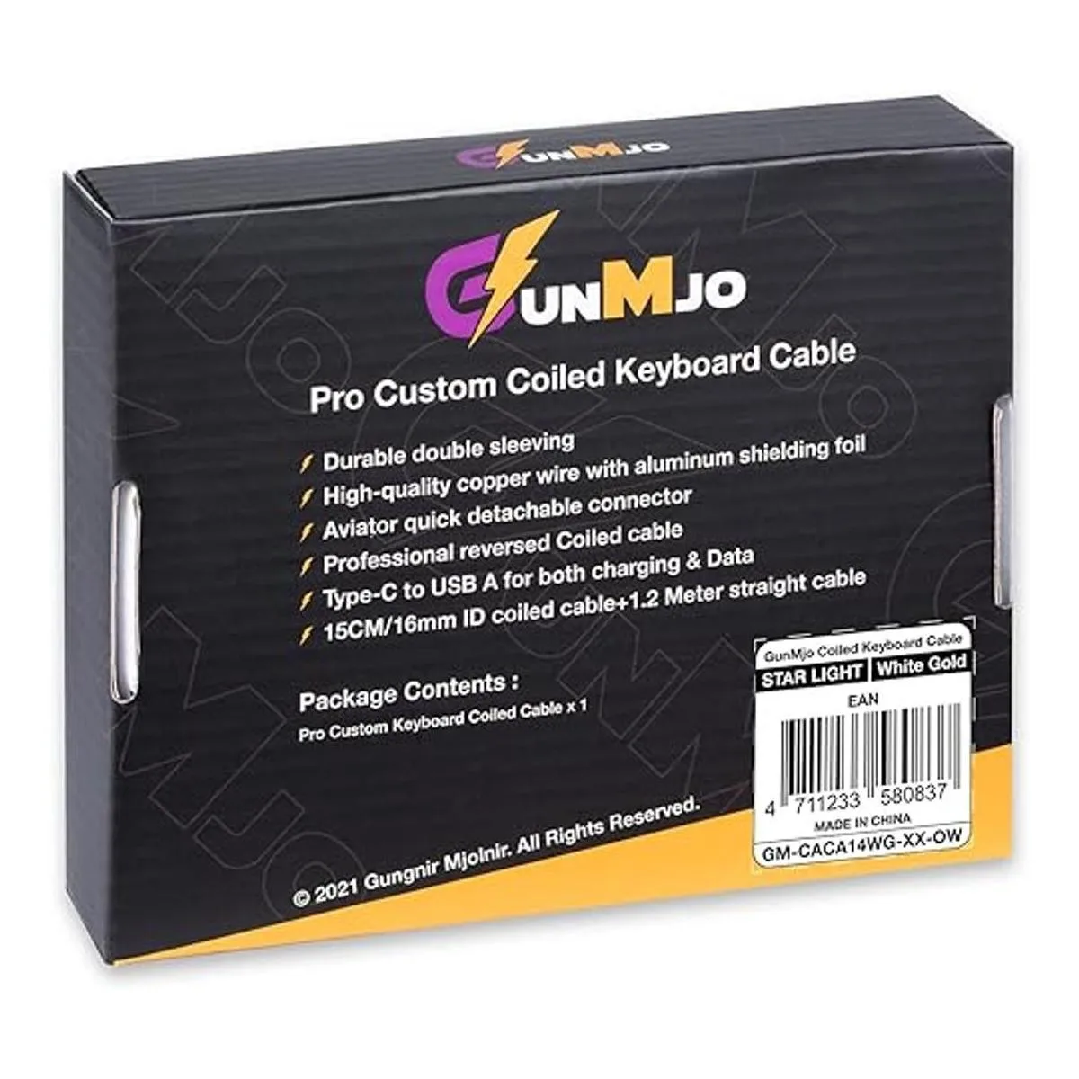 GunMjo Starlight Cable de teclado USB C en espiral para teclado de juegos, cable de teclado mecánico de doble manga con aviador de metal desmontable, USBC de 1.5 M a USBA, color blanco con conector de aviador dorado