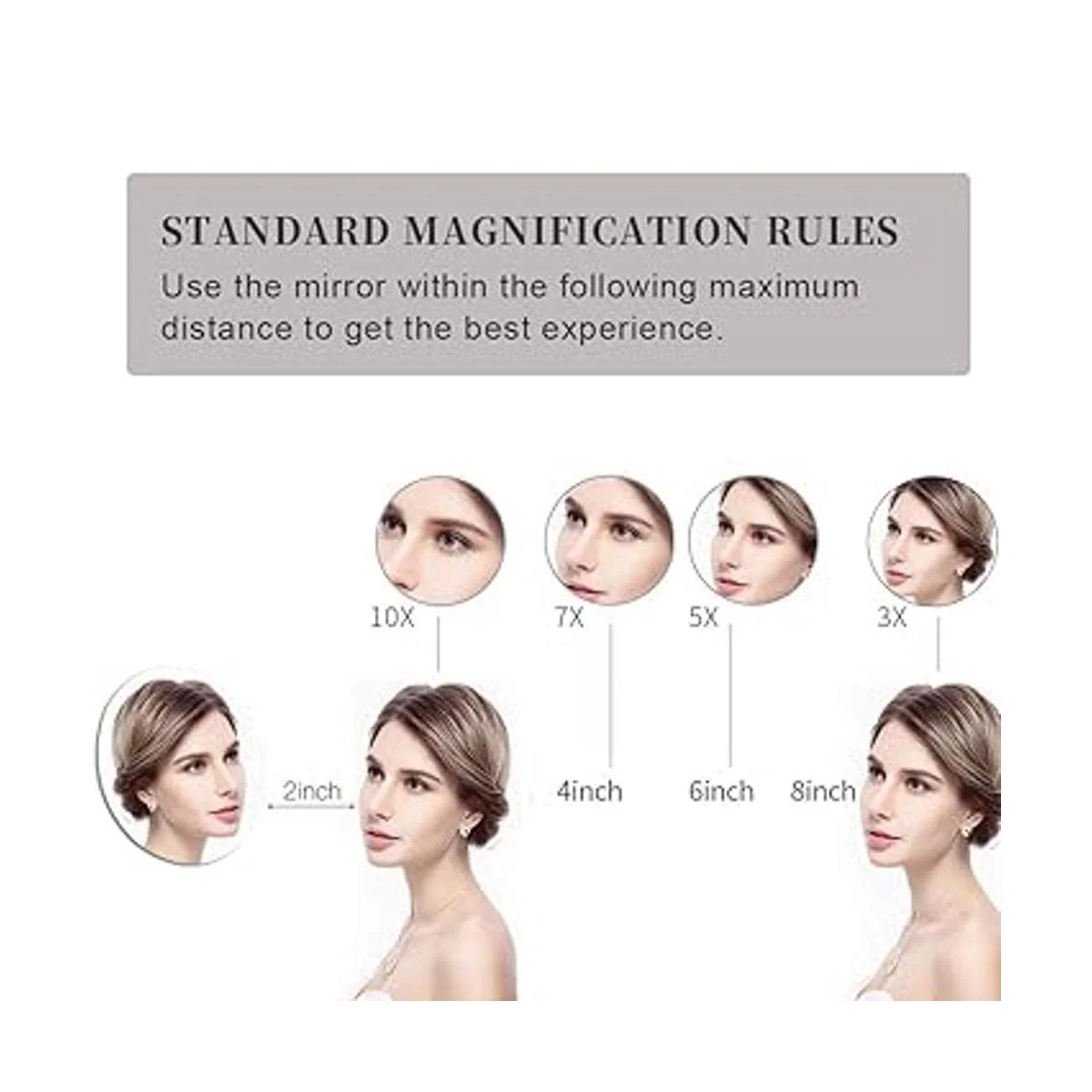 Espejo de doble cara: utilizamos espejo chapado en plata de alta definición para asegurarnos de que no te pierdas ningún detalle. 1 y 10 unidades pueden satisfacer todas tus necesidades de espejos, 1 muestra una imagen real de alta definición, 10 para depilar cejas y algunos vellos faciales claros y esto muestra todo. La distancia entre tú y el lado de 10 x debe ser de 2 pulgadas.
