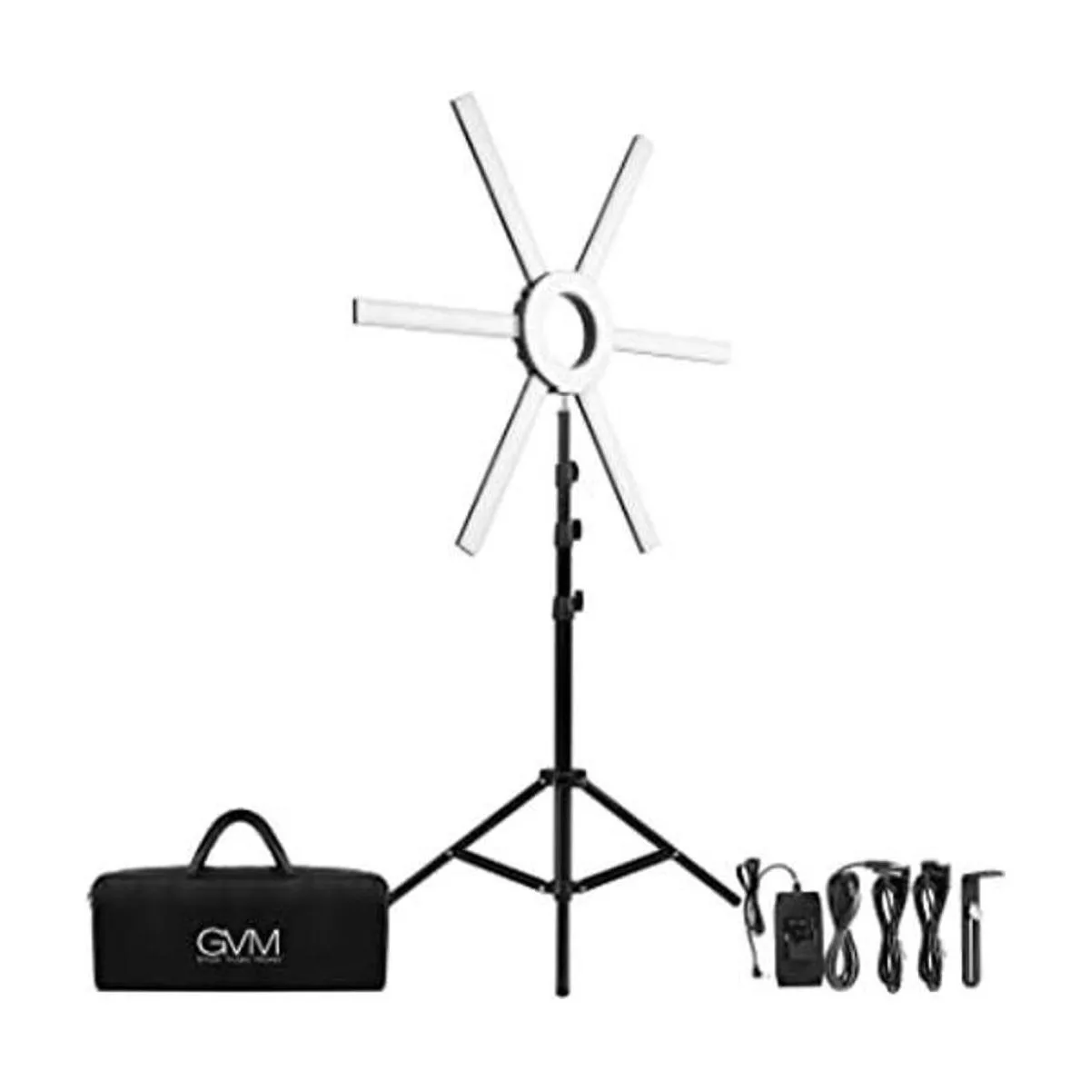 El paquete incluye: 1 anillo de luz LED, 6 barras de luz LED, 1 adaptador de CA, 2 cables de alimentación, 1 trípode de luz, 1 soporte para cámara, 1 bolso portátil