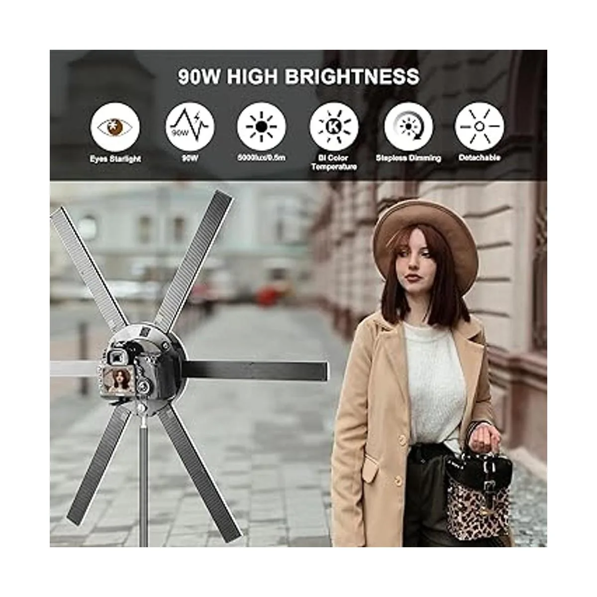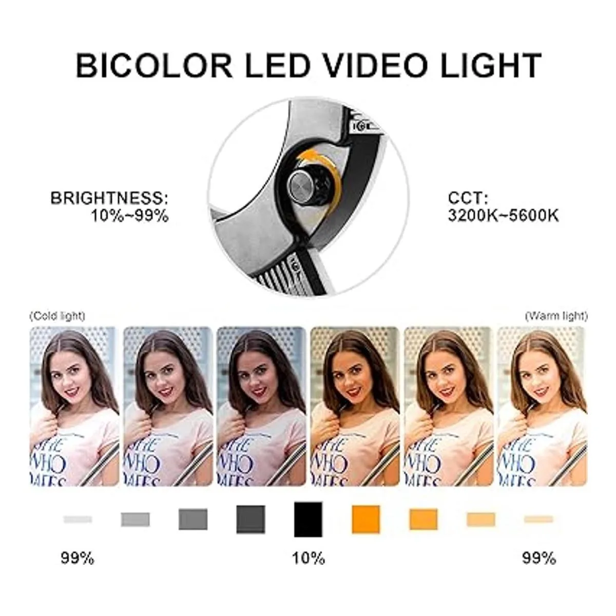 Barras de luz versátiles: viene con 2 cables de alimentación y 2 de las barras de luz pueden llegar más allá de la luz del anillo y todavía se iluminan sin embargo, la temperatura de color/brillo no se puede ajustar, llena la luz de forma flexible con cualquier ángulo para tu disparo