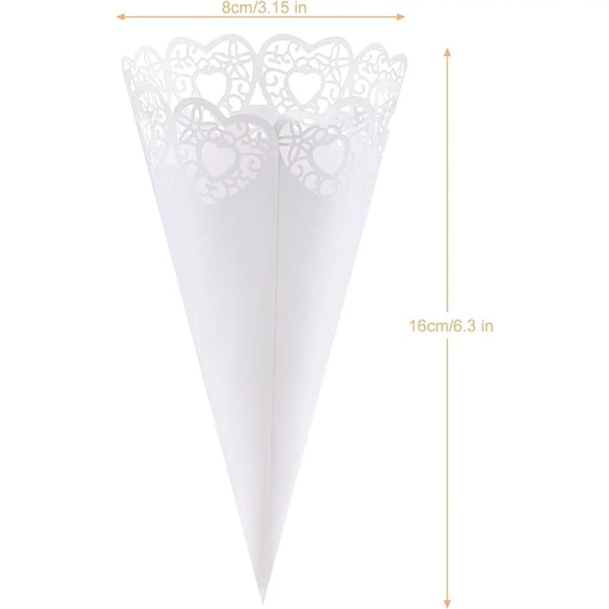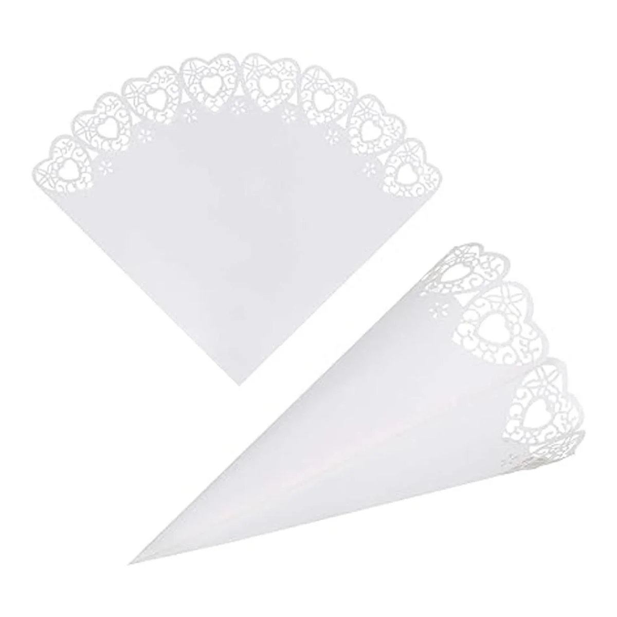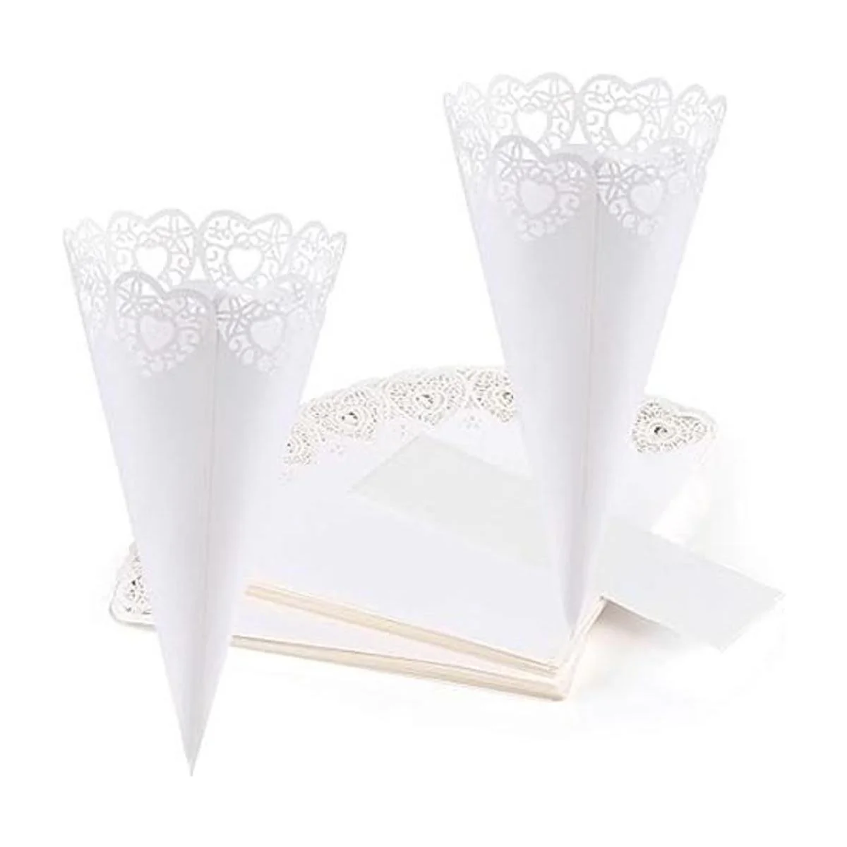 El paquete incluye: 100 conos de confeti de papel en forma de abanico con cintas fuertes de doble cara, suficiente para tu boda y buffet.