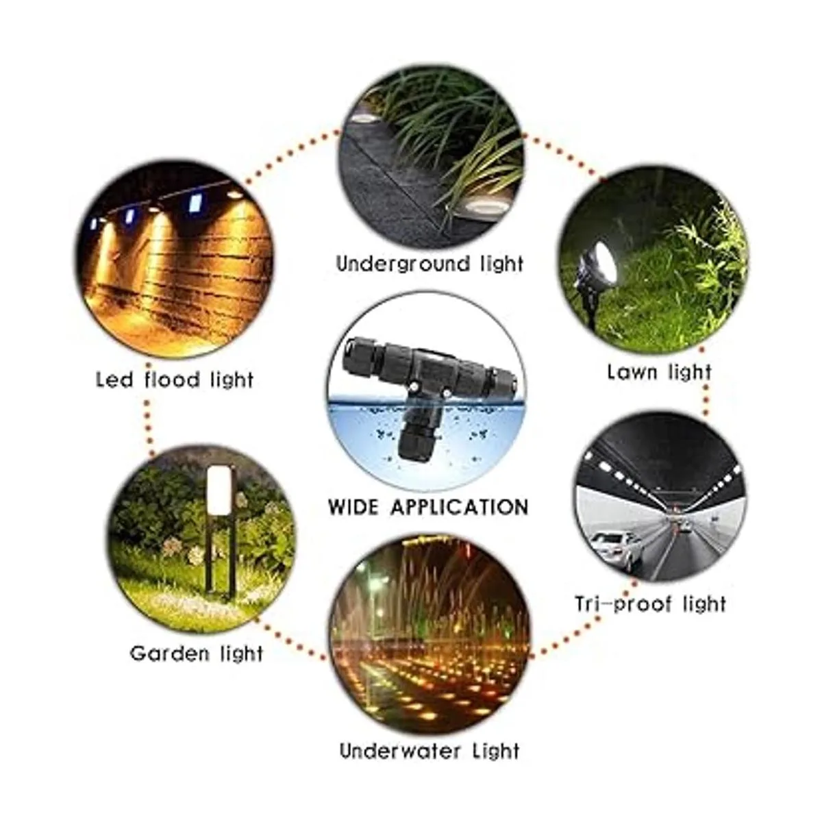 Amplia aplicación: estas cajas de conexiones impermeables de 3 vías son adecuadas para conectar y extender cables de alimentación para iluminación exteriores; ampliamente utilizadas para lámparas de jardín, luz de patio y otras luces LED al aire libre, ingeniería subacuática, ingeniería subterránea, ingeniería minera, sistema de panel solar y conexión de cable eléctrico