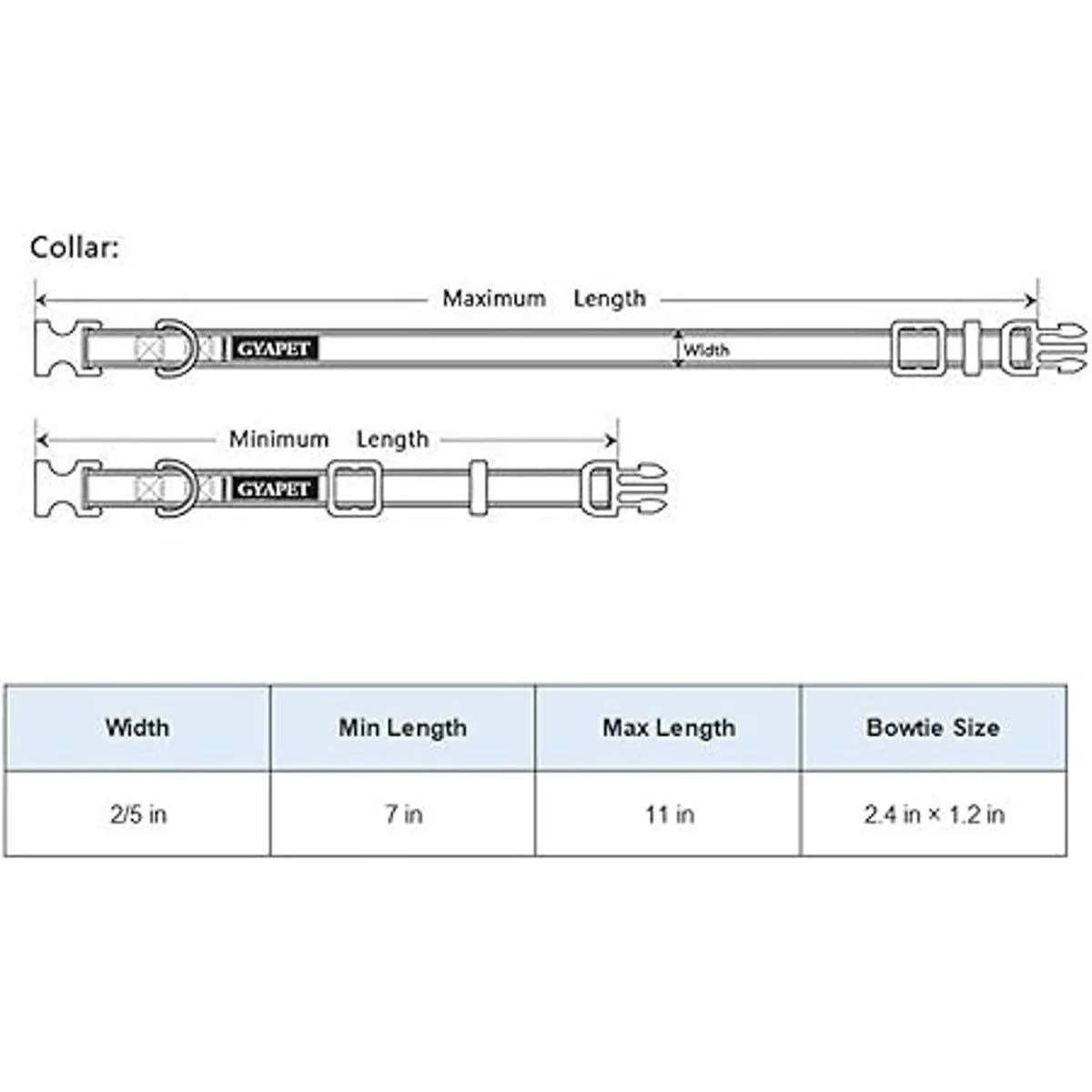 Tamaño: talla única para la mayoría de gatos. Ancho: 2/5 pulgadas, longitud de 7 a 11 pulgadas, gran rango ajustable. Tamaño del corbatín: 2.4 x 1.2 pulgadas, el lazo es móvil y desmontable