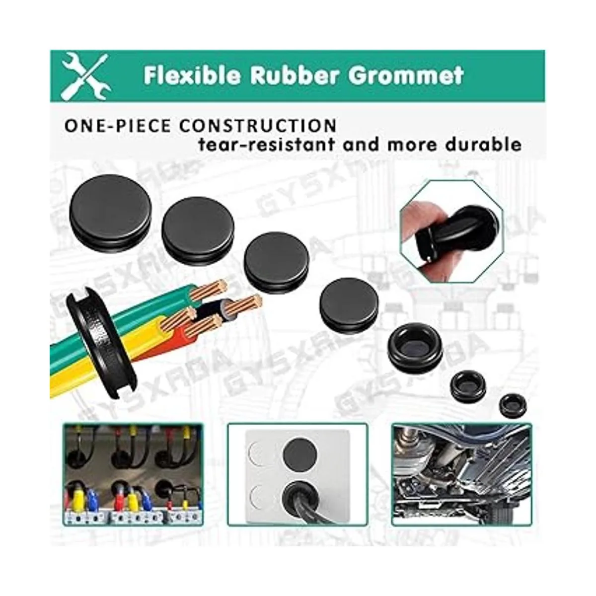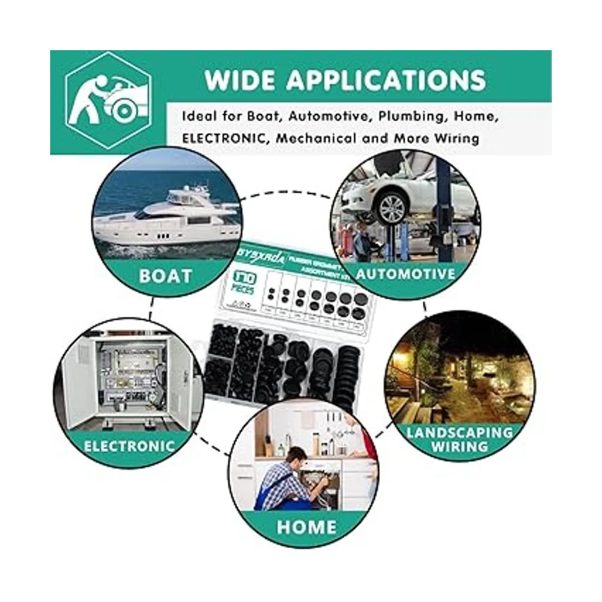 Amplia aplicación: el kit surtido de ojales de goma es útil en muchas profesiones como fontaneros, mecánicos, electricistas, bricolaje, etc., se utiliza para adaptarse a piezas juntas para electrodomésticos como automoción, barco, válvula, RV, bomba, cableado de paisajismo, muebles, detector de radar, cámara de respaldo de salpicadero/visión trasera, navegación GPS, altavoces de audio y cableado de diferentes mecanismos, etc.