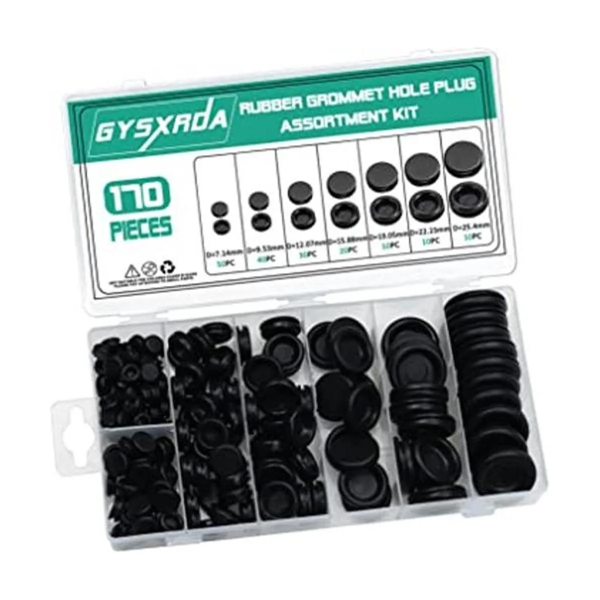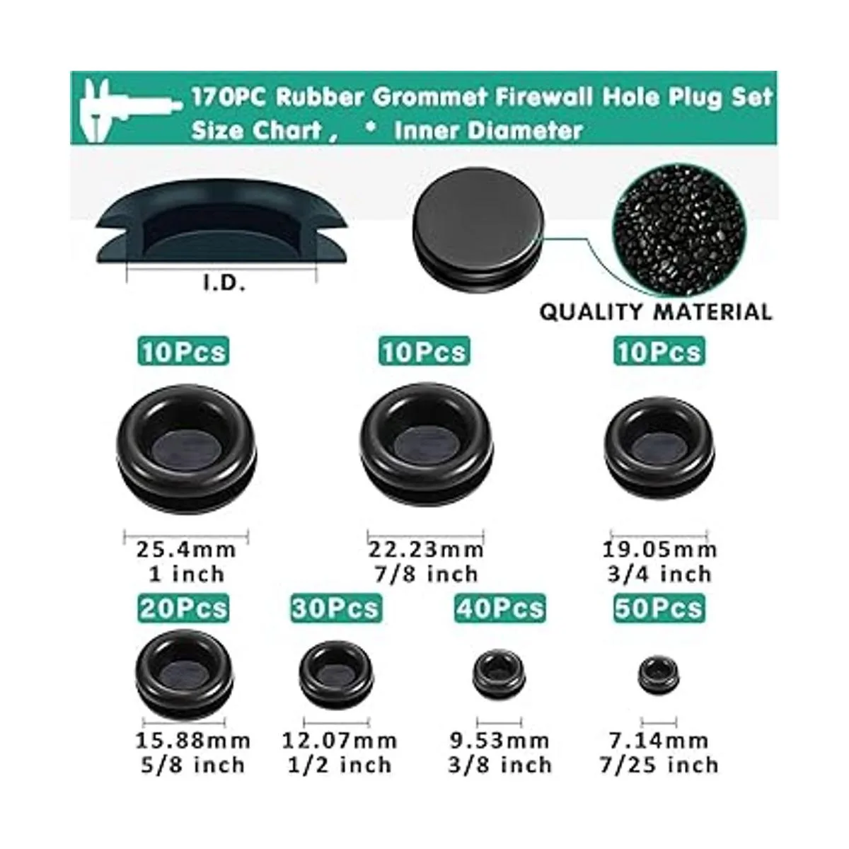Gysxrda Juego de 170 ojales de goma Surtido de ojales para cortafuegos negros, 7 tamaños, enchufe de agujero de goma para agujeros, electricidad, fontanería, automotriz, barco, organización de tuberías de alambre para mejorar el hogar