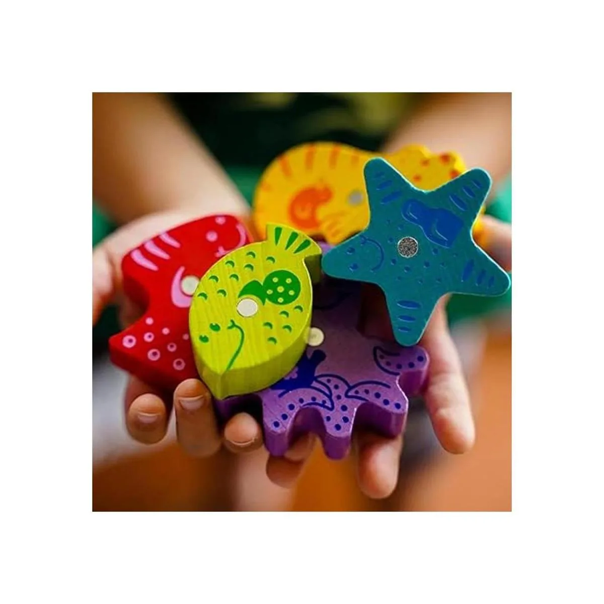 El contenido incluye: 1 caña con gusano, 6 habitantes del mar, 1 mar parte inferior de la caja, 4 tablas de recogida con cinco juguetes para salir y 1 troquel con símbolos.