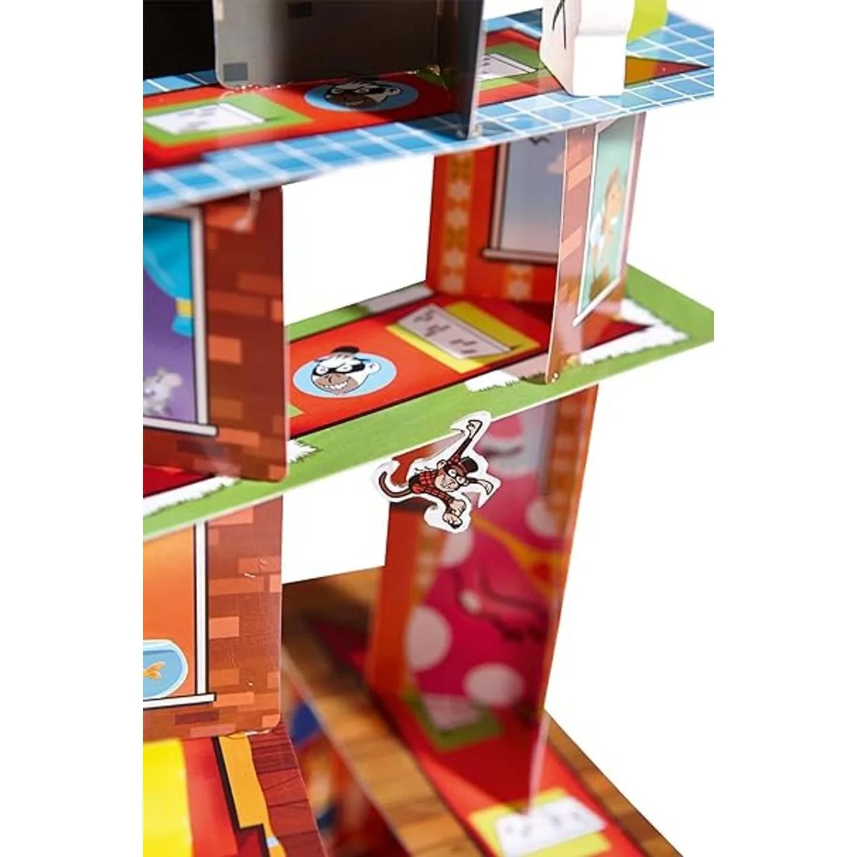 Contenido: 1 tablero de juego, 30 plantas, 24 paredes cortas, 24 paredes altas, 3 dados de color rojo/azul/celeste, 4 monos araña, 4 superhéroes Héroe Rino, Chico Jirafa, Big E. y Batguin, 1 medalla de superhéroe e instrucciones.