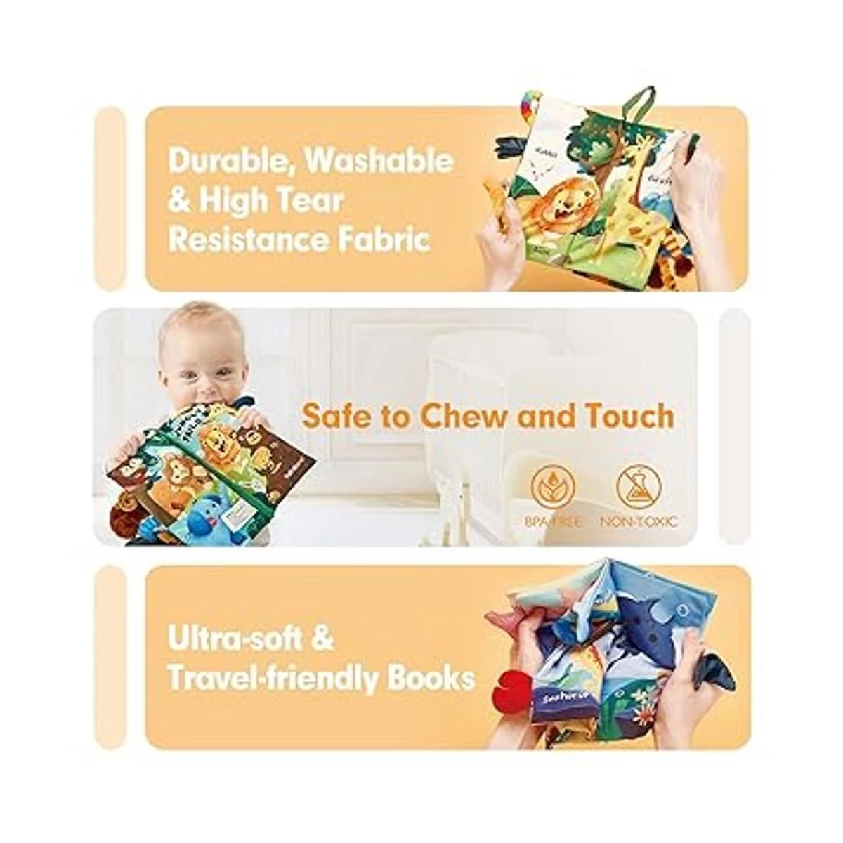 Todo para la seguridad del bebé: viene en un juego de 2, uno en colas de la selva, el otro en la vida marina. Un total de 20 páginas. Hecho de libre de BPA, casi fuera de tela y es suave al tacto y masticable, fácil de usar por el bebé sin dañarse. Sin piezas pequeñas o sueltas para evitar el peligro de asfixia y las costuras son lo suficientemente fuertes como para soportar la masticación. Cuenta con suave, ligero y fácil de limpiar para que se pueda llevar a cualquier lugar y los colores y gráficos no se desvanecen fácilmente y se pueden mantener con solo un lavado rápido.