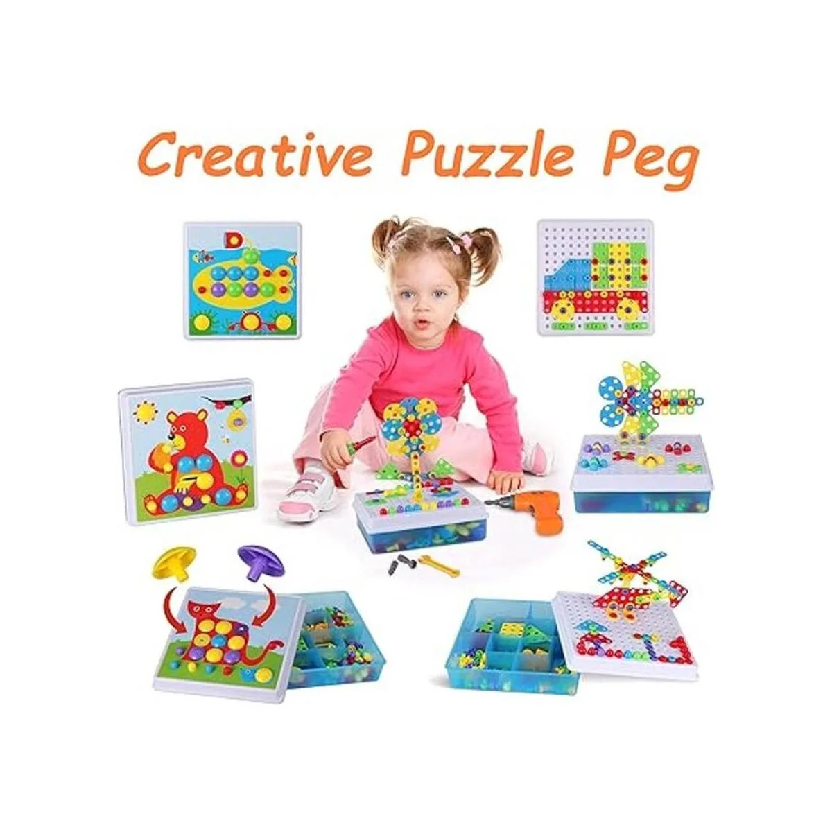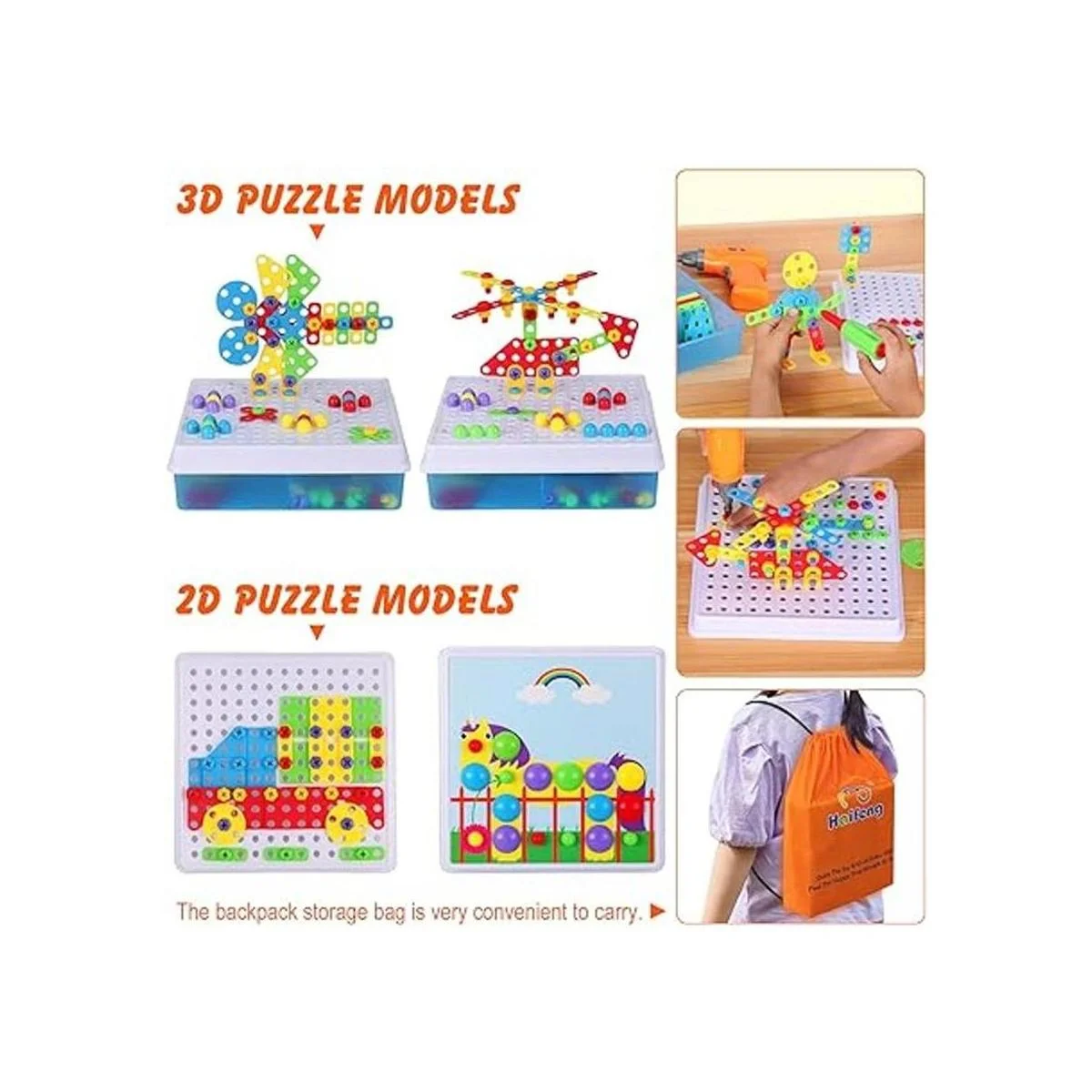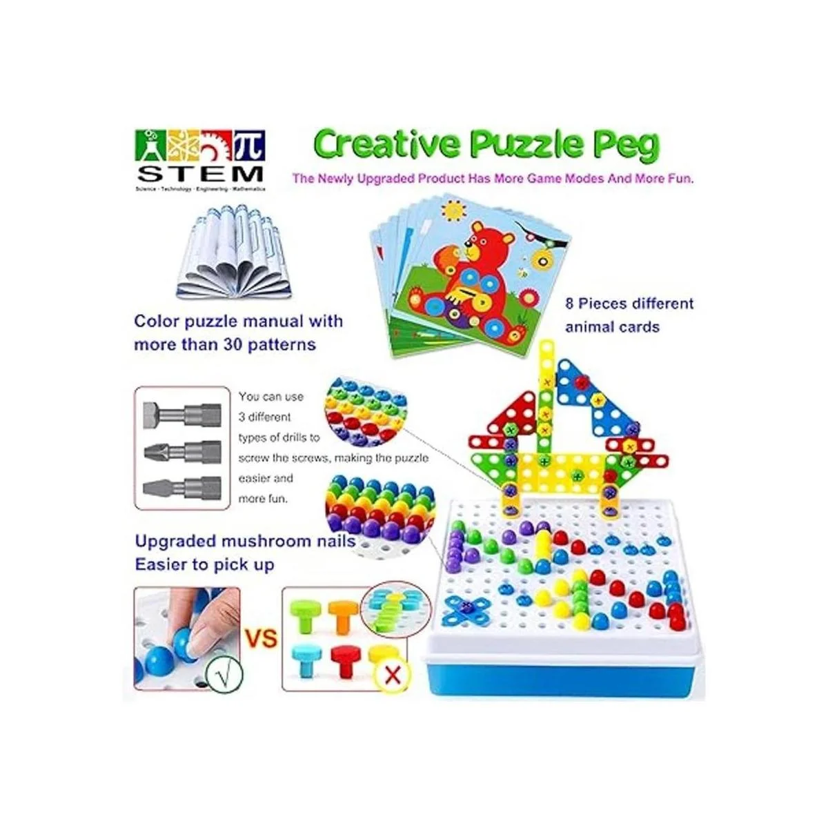 Kit creativo de construcción de juguete de mosaico para niños pequeños: el kit de taladro de juguete de construcción de 235 piezas contiene 4 piezas de mosaico de diferentes colores y formas, que pueden proporcionar a los niños más espacio de diseño y dejar que los niños den juego completo a su imaginación en el juego. Con 2 uñas de hongos de diferentes colores y formas, así como 8 tarjetas de animales diferentes, fijando con tornillos y tuercas, los niños pueden hacer varios modelos, estimulando así la imaginación espacial de los niños y la creatividad.