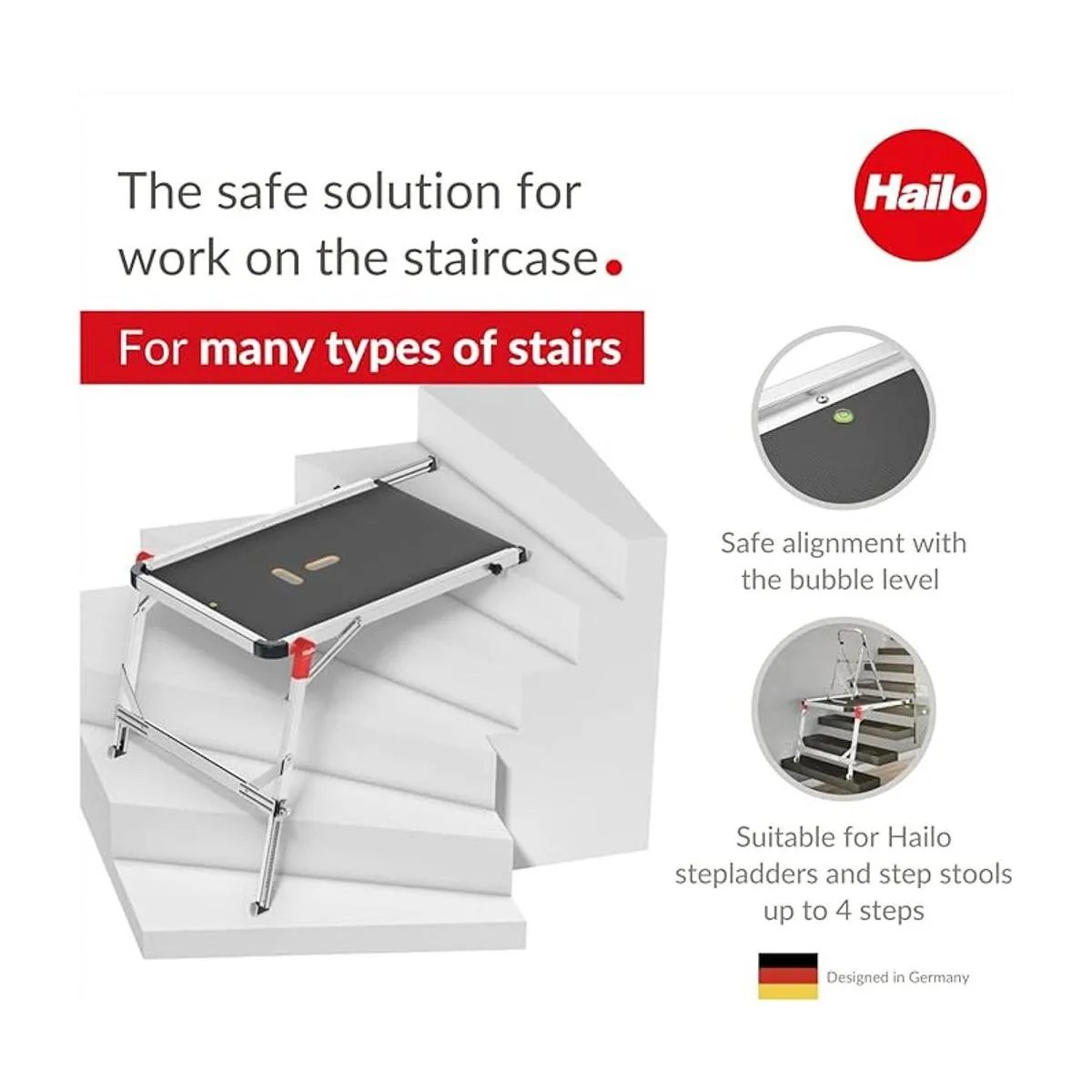 Hailo TP1 Plataforma de escalera Rieles y pies telescópicos ajustables de longitud y altura Nivel de burbuja integrado Mecanismo de desbloqueo de seguridad de dos manos para uso con taburetes y escalones
