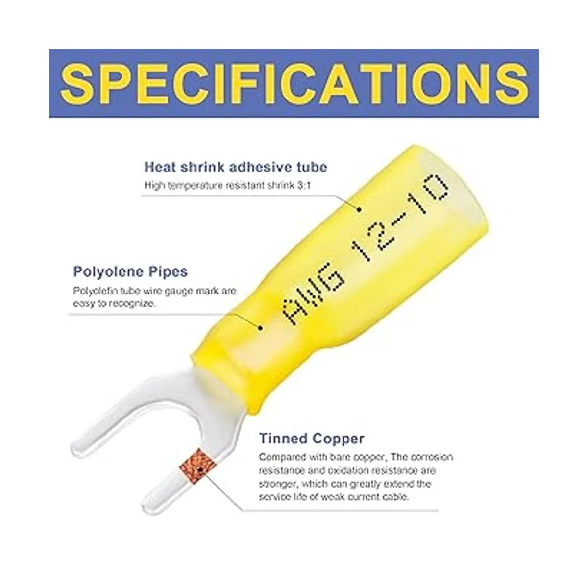 Haisstronica 120 conectores de horquilla termocontraíble de grado marino amarillo calibre 1210, cobre rojo estañado de 0.039 in, conectores de crimpado 10, terminales de horquilla, conectores eléctricos aislados para aeronaves, barcos, camiones, estéreo