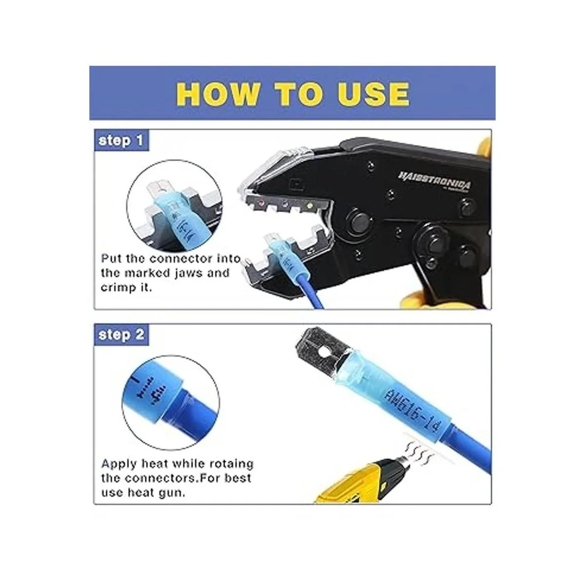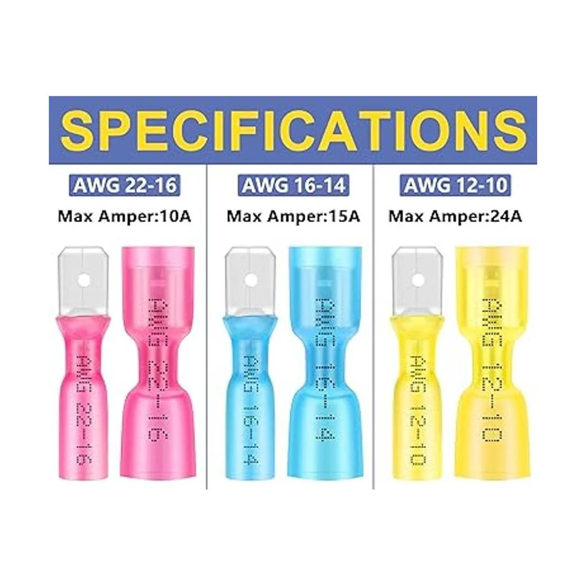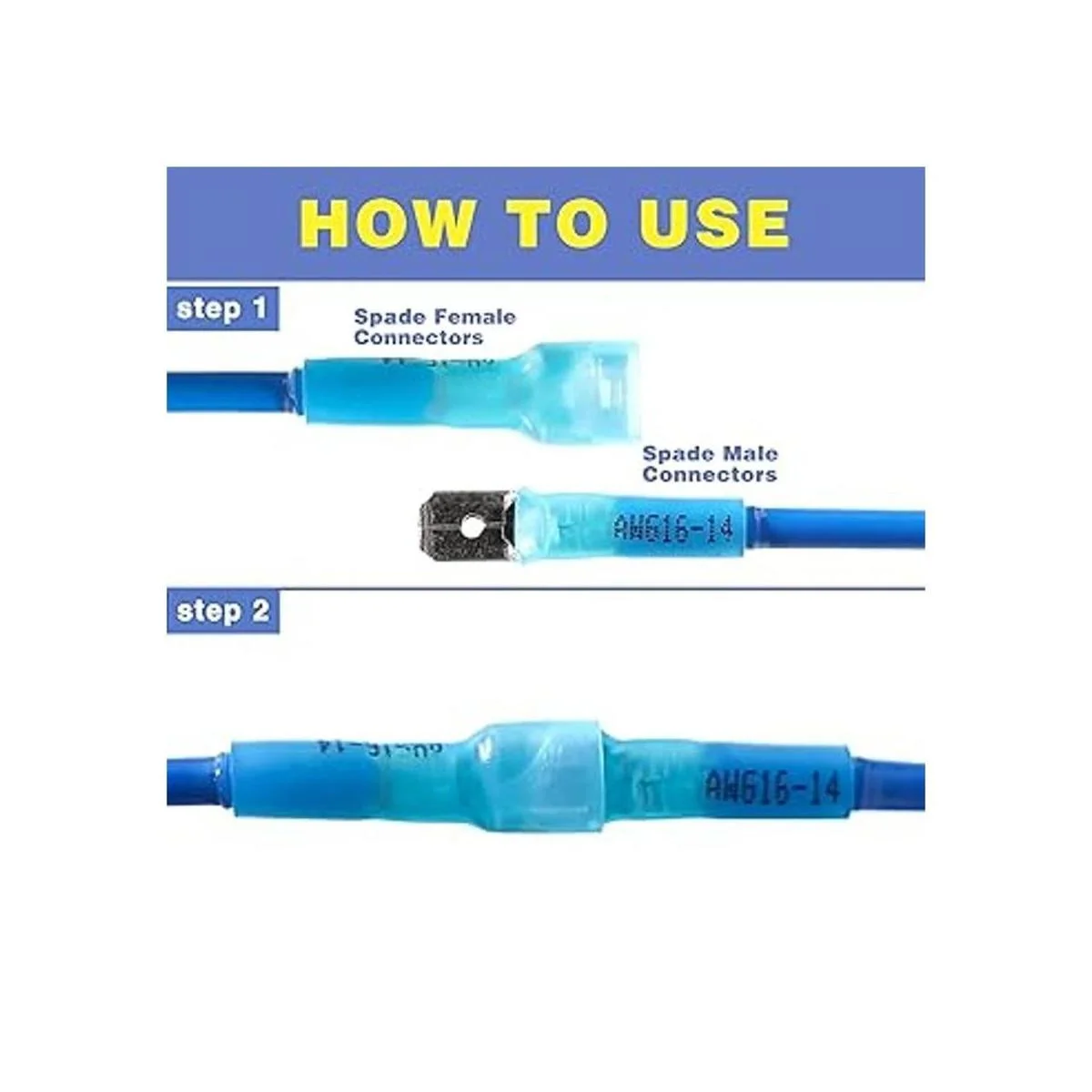 Tubo termorretráctil 3:1: los conectores de pala termorretráctiles están hechos de tubo termorretráctil de polietileno de alta calidad que no se rompe fácilmente durante el crimpado. Resistente a la corrosión, especialmente si se utiliza en una zona cerrada que está sujeta al calor; no se suavizan ni se separan.