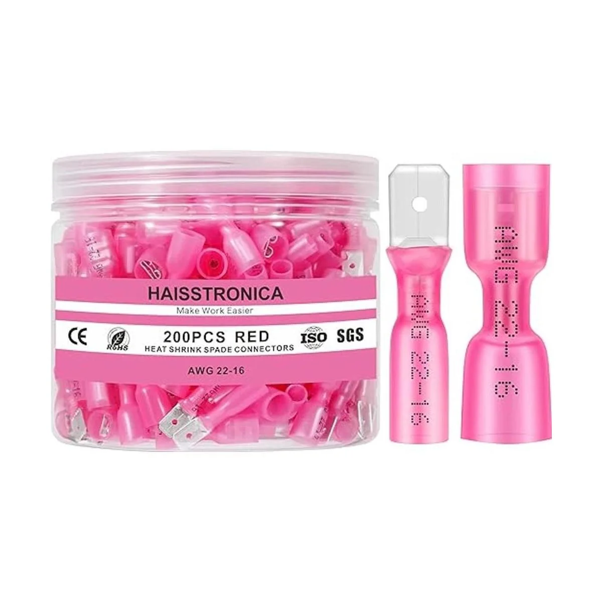 haisstronica 200 conectores de pala termocontraíble color rojo, AWG 2216 terminlas de pala termocontraíble, conectores de cable eléctricos de desconexión rápida macho y hembra