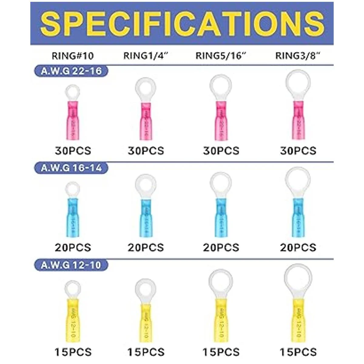 Aplicación flexible: los 260 terminales de anillo termorretráctil funcionan para calibre de alambre AWG2216/AWG1614/AWG1210, incluyendo terminales de anillo 10,1/4, 5/16, 3/8. Para motocicletas, automóviles, tractores, barcos, etc.