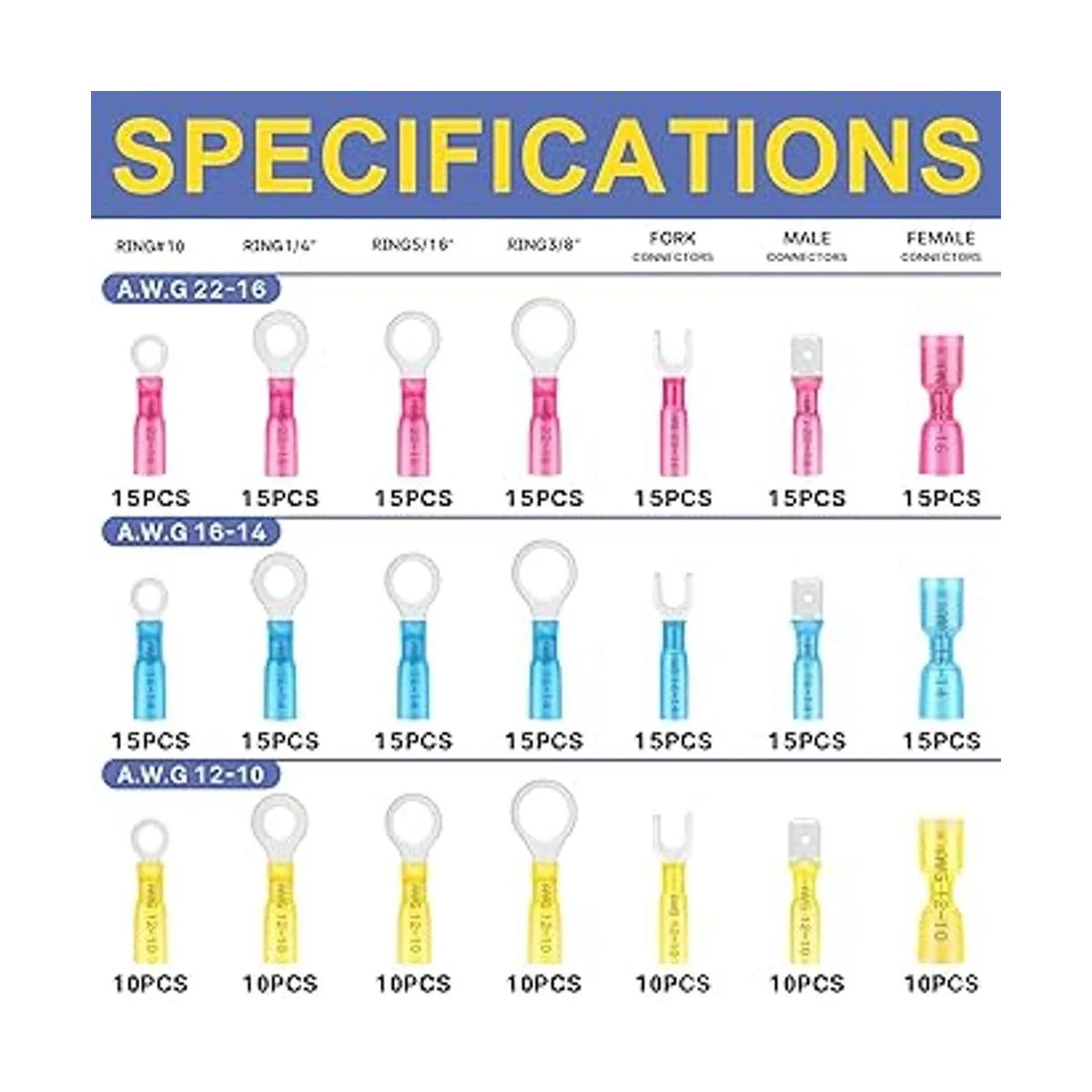 Kit de conectores de alambre termorretráctiles diseñado para escenarios específicos: el kit incluye conectores de pala termorretráctiles, conectores de horquilla y conectores de anillo. Proporciona opciones de ahorro de tiempo y ahorro de espacio para proyectos de cableado.