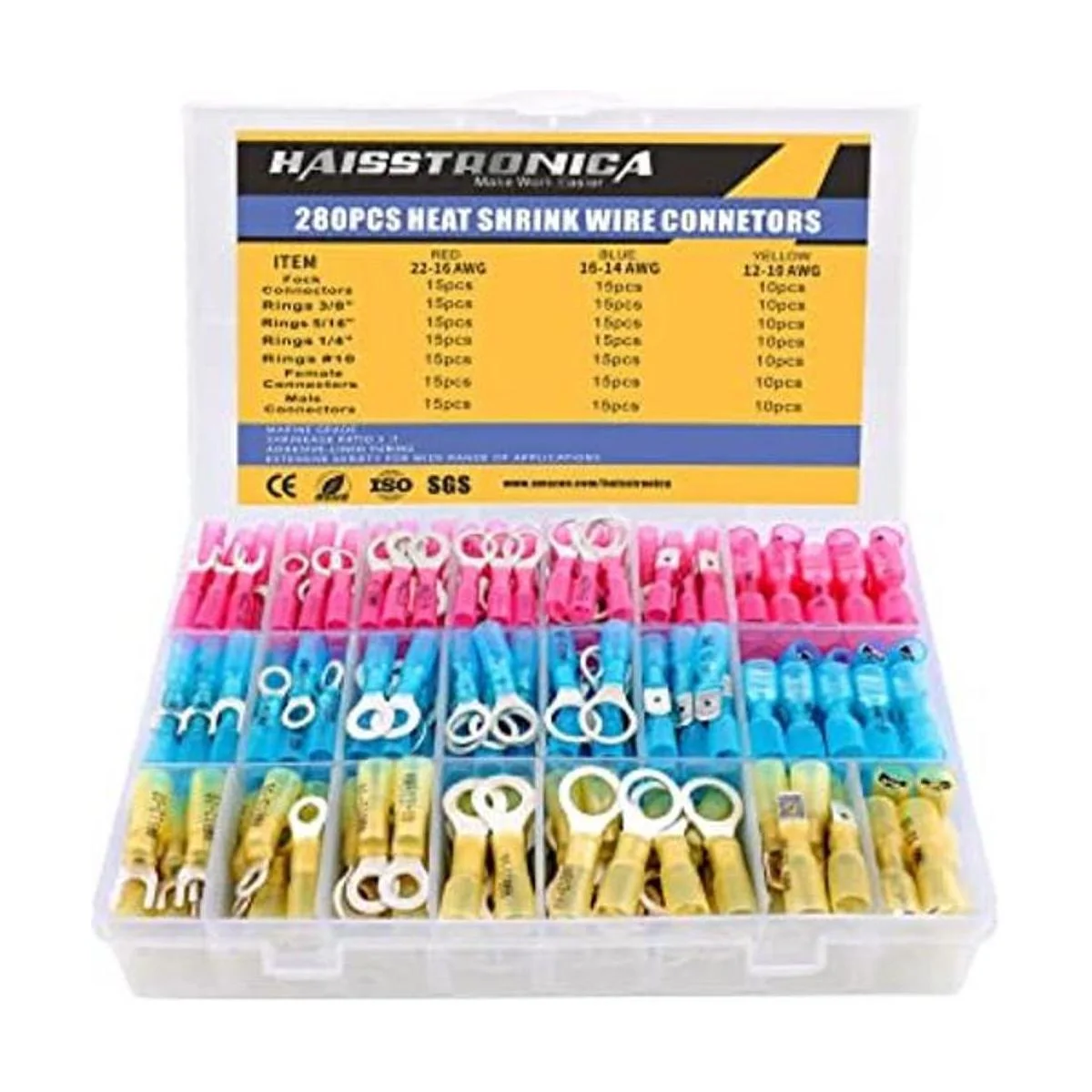 haisstronica 280 conectores de alambre termorretráctil de grado marino, kit de conectores eléctricos de cobre rojo estañado, anillo aislado de engarzado, tenedor, pala de empalme 3 colores21 tamaño calibre 1614 2216 1210