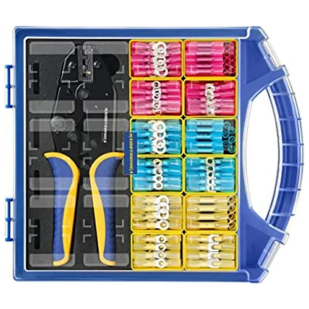 El kit completo incluye 380 conectores de alambre termorretráctiles, 1 herramienta de crimpado y un organizador