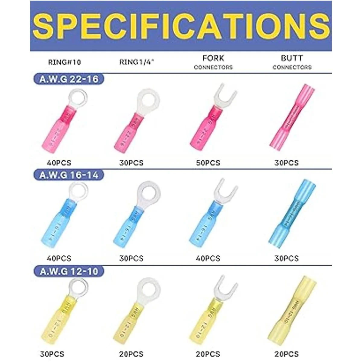 haisstronica Juego de 380 conectores de cable termorretráctil de grado marino, kit de conectores de cable eléctrico de 2210 AWG, empalme de extremo de horquilla de anillo 3 colores12 tamaño, con herramientas de prensado termorretráctil de 9 pulgadas y organizador